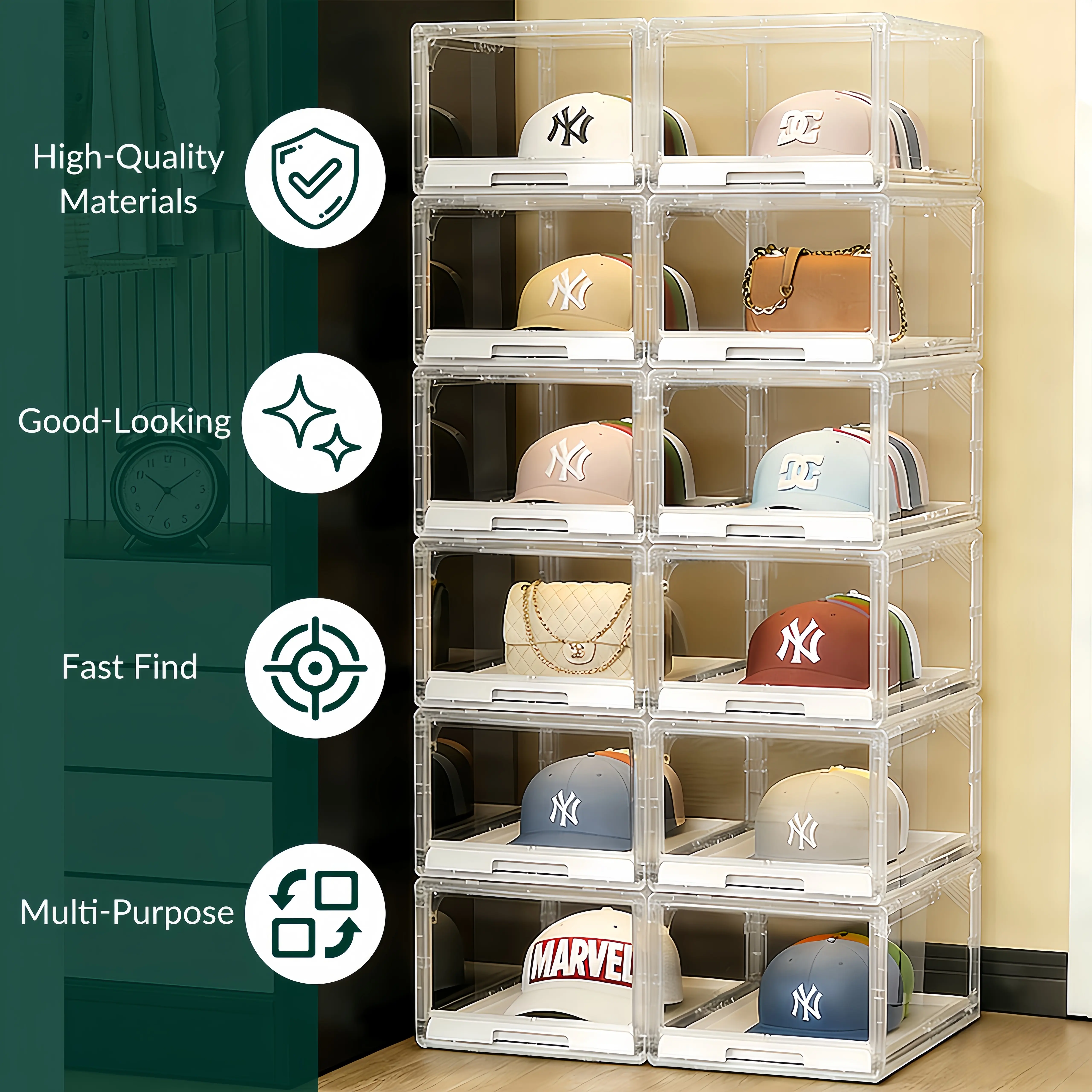 UV-resistant clear material keeps hats 100% dust-free while fully visible. Display your collection like a showcase without opening the box. Its sleek design upgrades any closet or room decor.