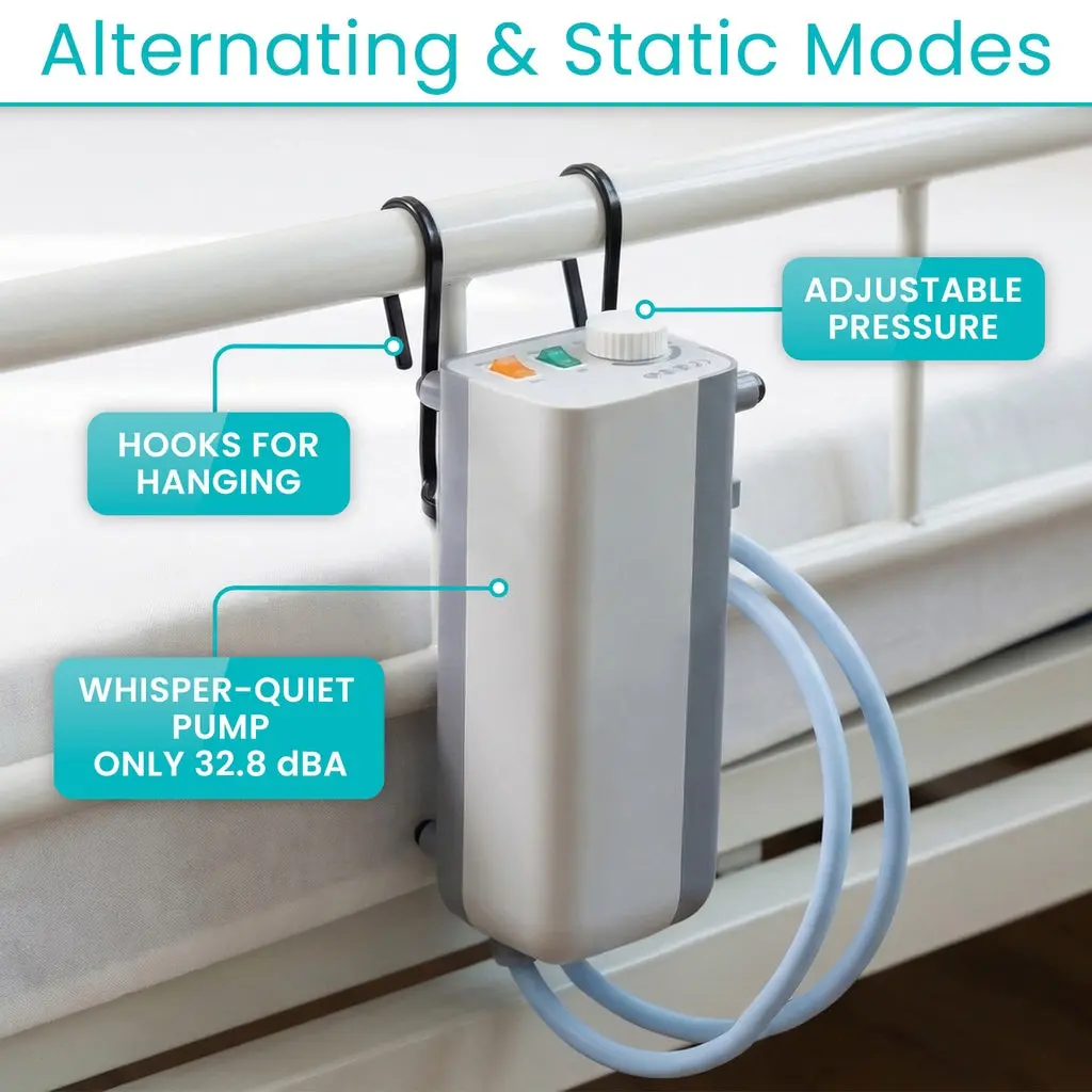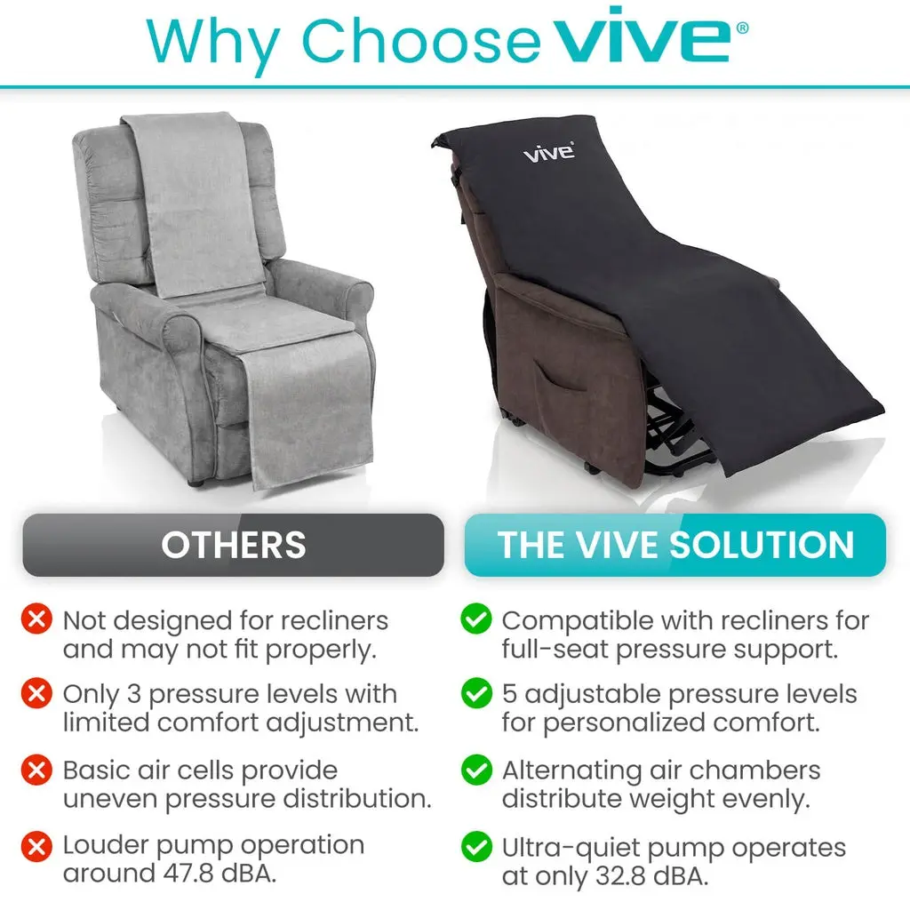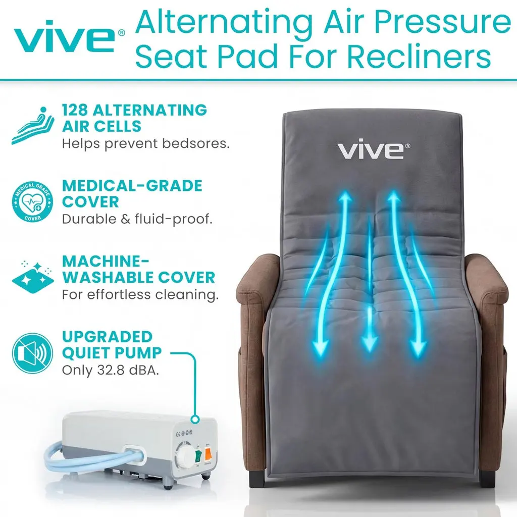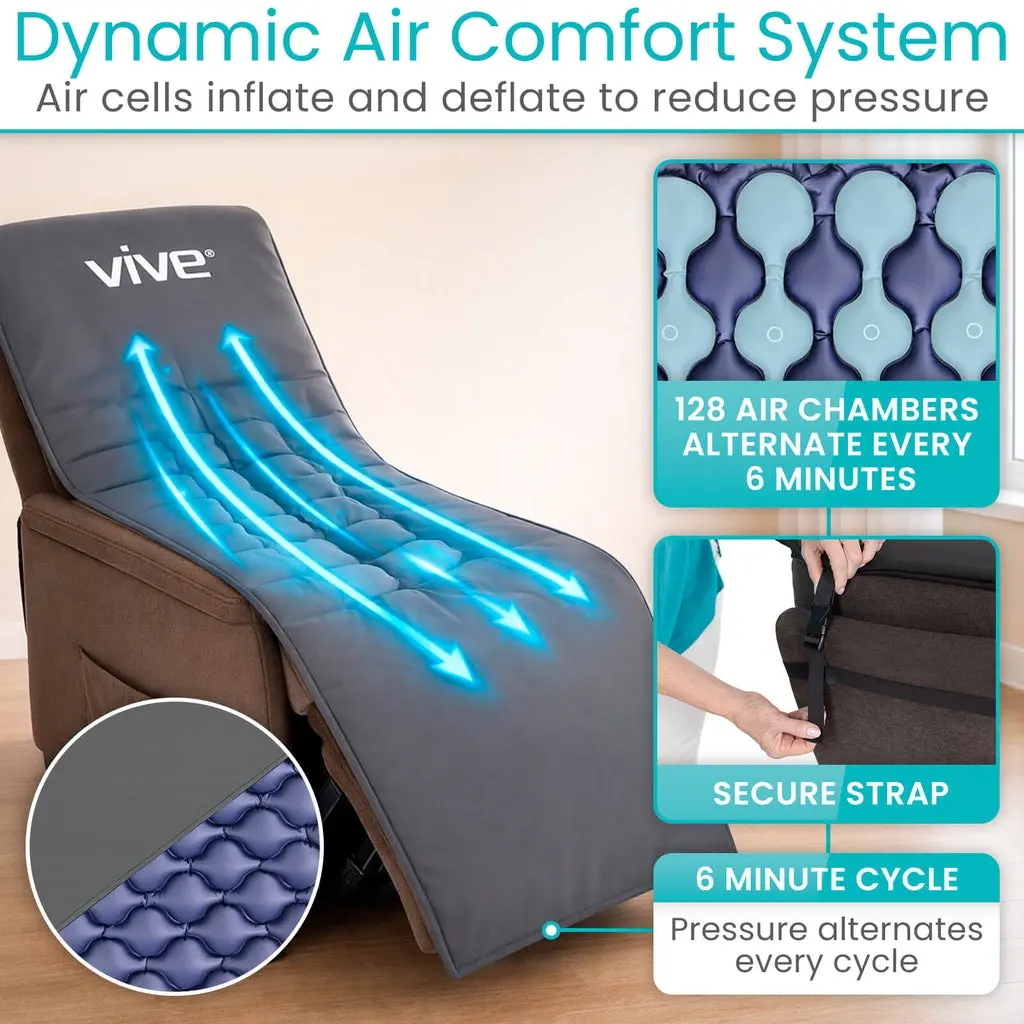 The Vive Health Alternating Pressure Seat Pad provides active pressure redistribution for individuals in recliners, wheelchairs, or standard chairs. The system uses 128 individual air cells that cycle inflation and deflation to vary support points during extended sitting. The included pump is adjustable for custom firmness and operates quietly at 32.8 dBA. Features a non-slip base, secure attachment straps, and a wipe-clean PVC/Nylon surface.