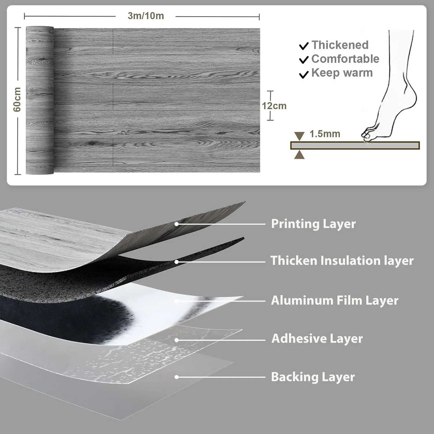 Upgraded Extra Thickness-Our vinyl flooring is created using a five-layer process that involves throwing and pressing PVC materials, providing extra thickness for increased durability and longevity.The added thickness also makes it more comfortable to walk on.You will receive: one 1000cm x 60cm roll of vinyl flooring.Wear and Water-Resistant-Crafted from durable and high-quality PVC materials, our vinyl plank flooring are resistant to wear and tear, as well as water damage.Easy Peeling and Sticking-Our vinyl floor tiles are designed to be easily installed on any clean, flat surface, including concrete, wood, and tile.With a high-quality adhesive backing, these tiles can be easily peeled and stuck onto your floor, without the need for any additional tools.Affordable and Low Maintenance-Our vinyl plank flooring is a cost-effective, easy to clean and maintain, making it a popular choice for budget-conscious and busy households.Simply wipe it down with a damp cloth or mop to keep it looking new.Wide Applications-Our vinyl flooring has a high-quality wood grain pattern that resembles real hardwood, making it versatile for multiple spaces like bedrooms, living rooms, kitchens, offices, RVs, balconies, and more.