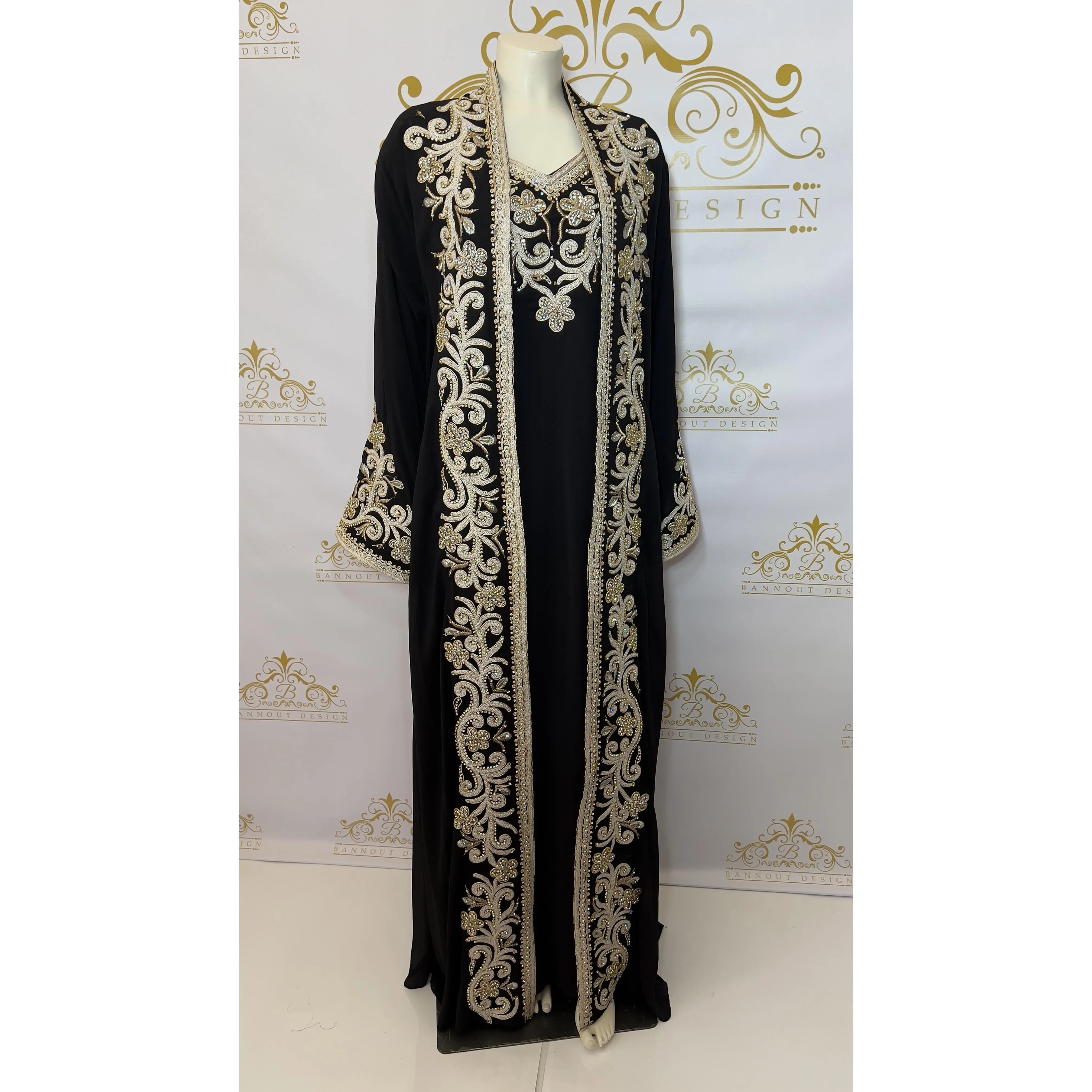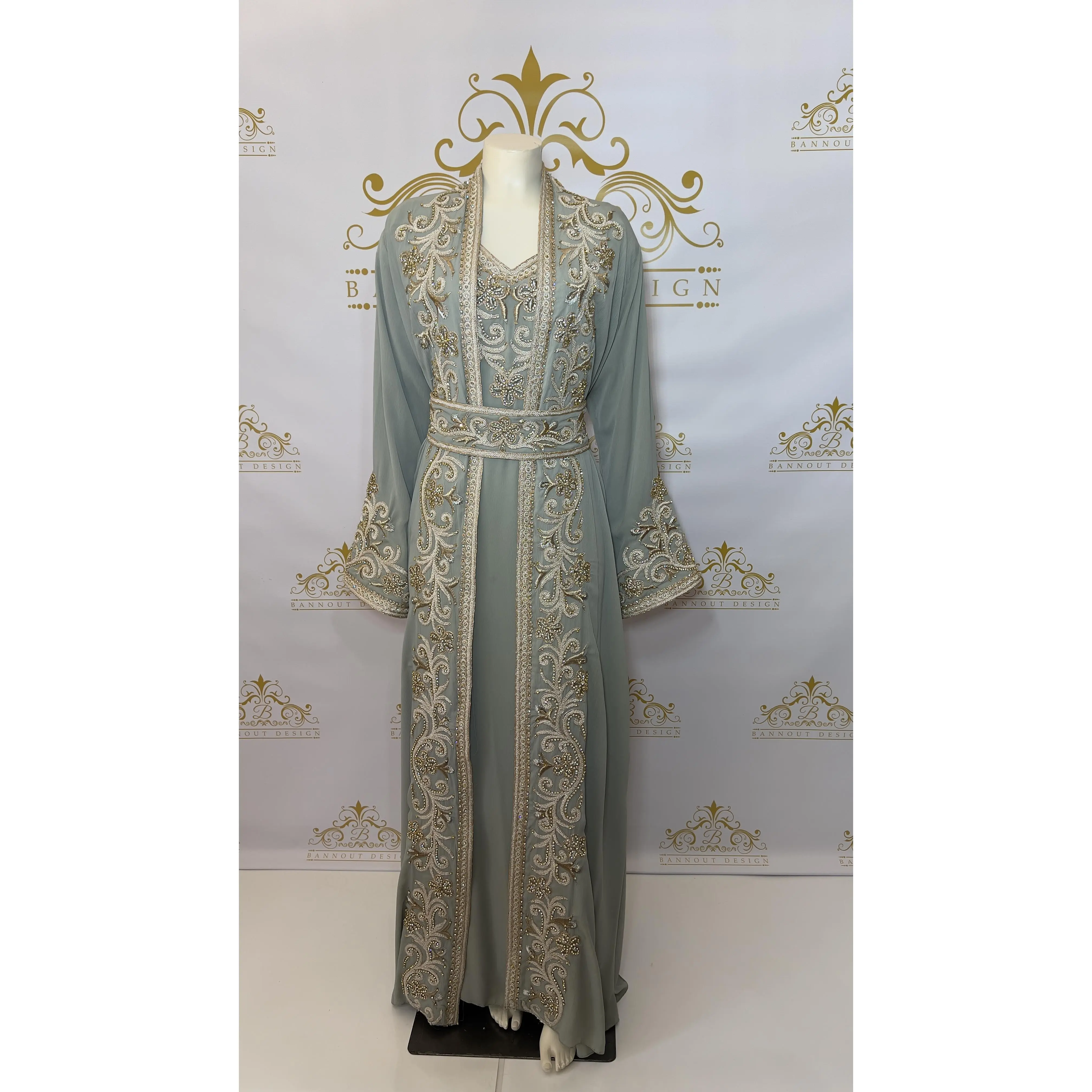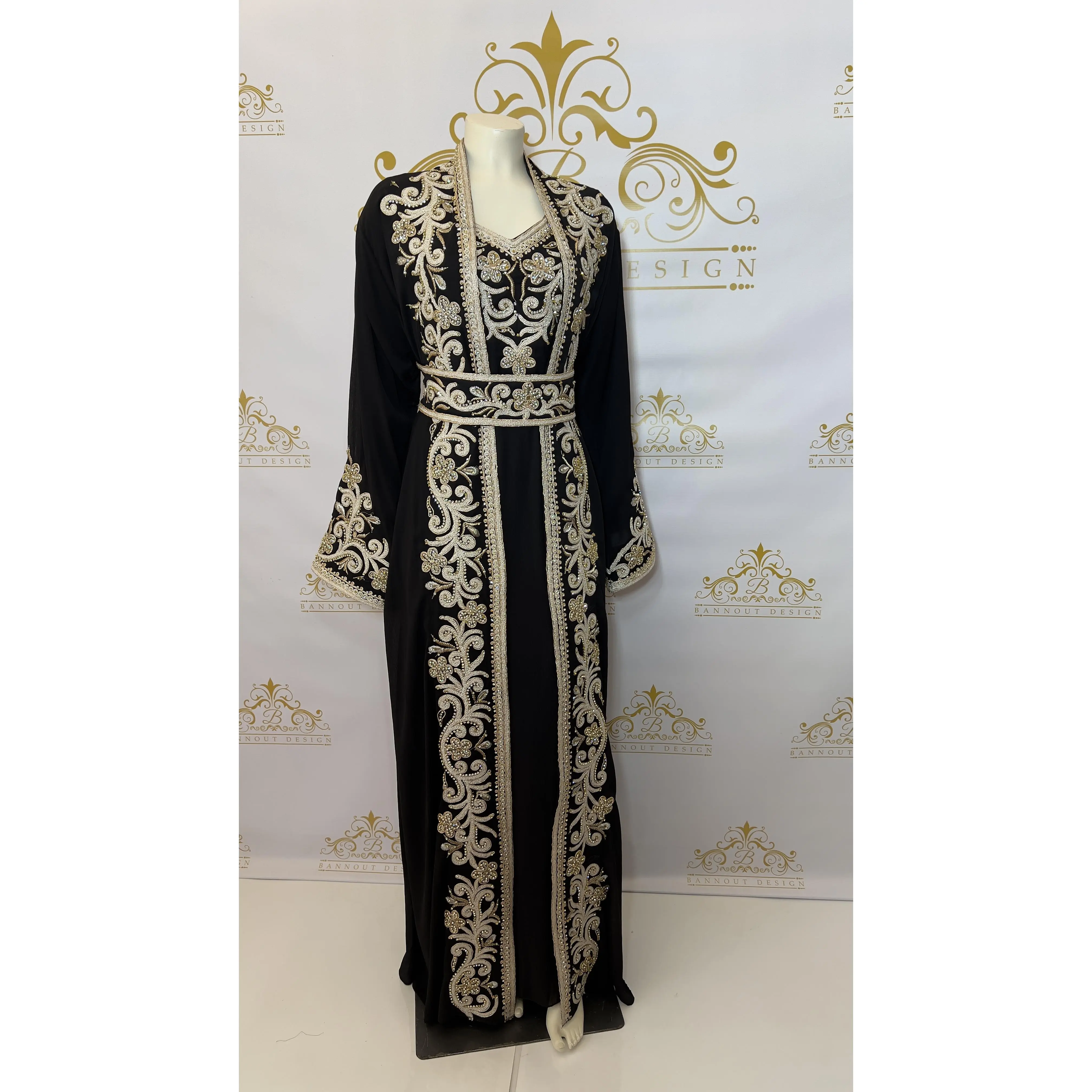 This Kaftan Abaya features a beautiful floral design with silver and gold embroidery and beads. The intricate detailing adds a touch of elegance to this 3-piece set. Made with quality materials and expert craftsmanship, this Kaftan Abaya is perfect for special occasions and everyday wear.