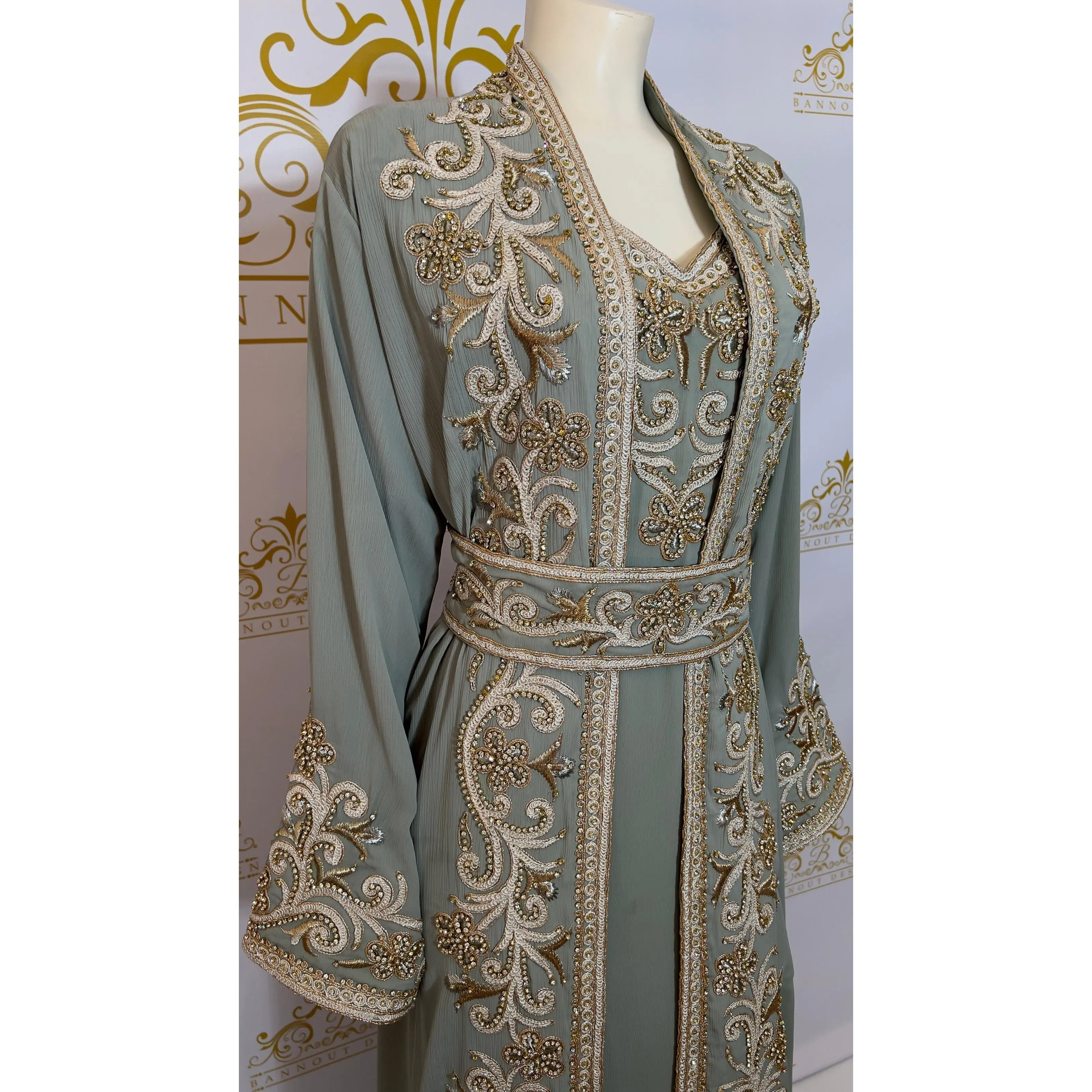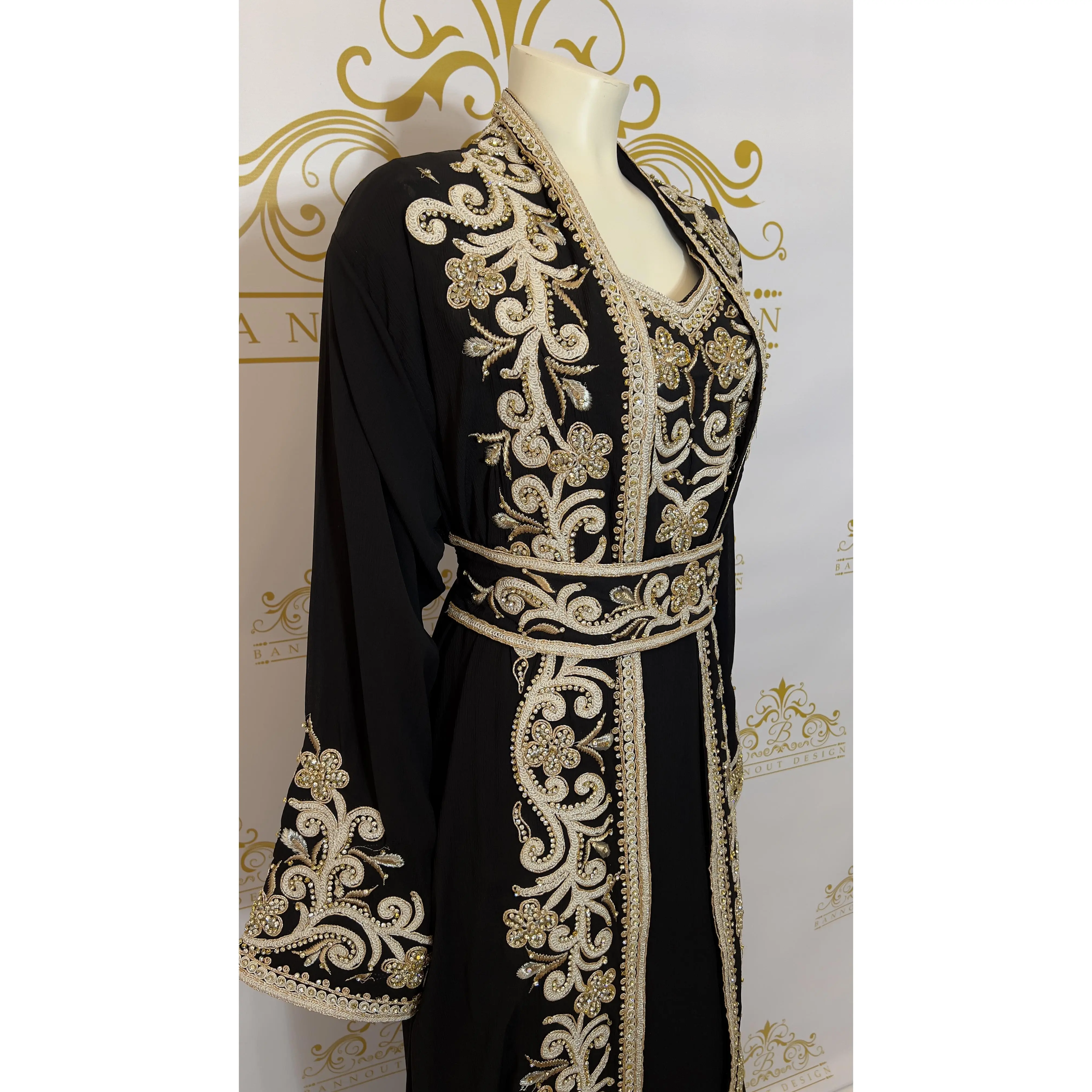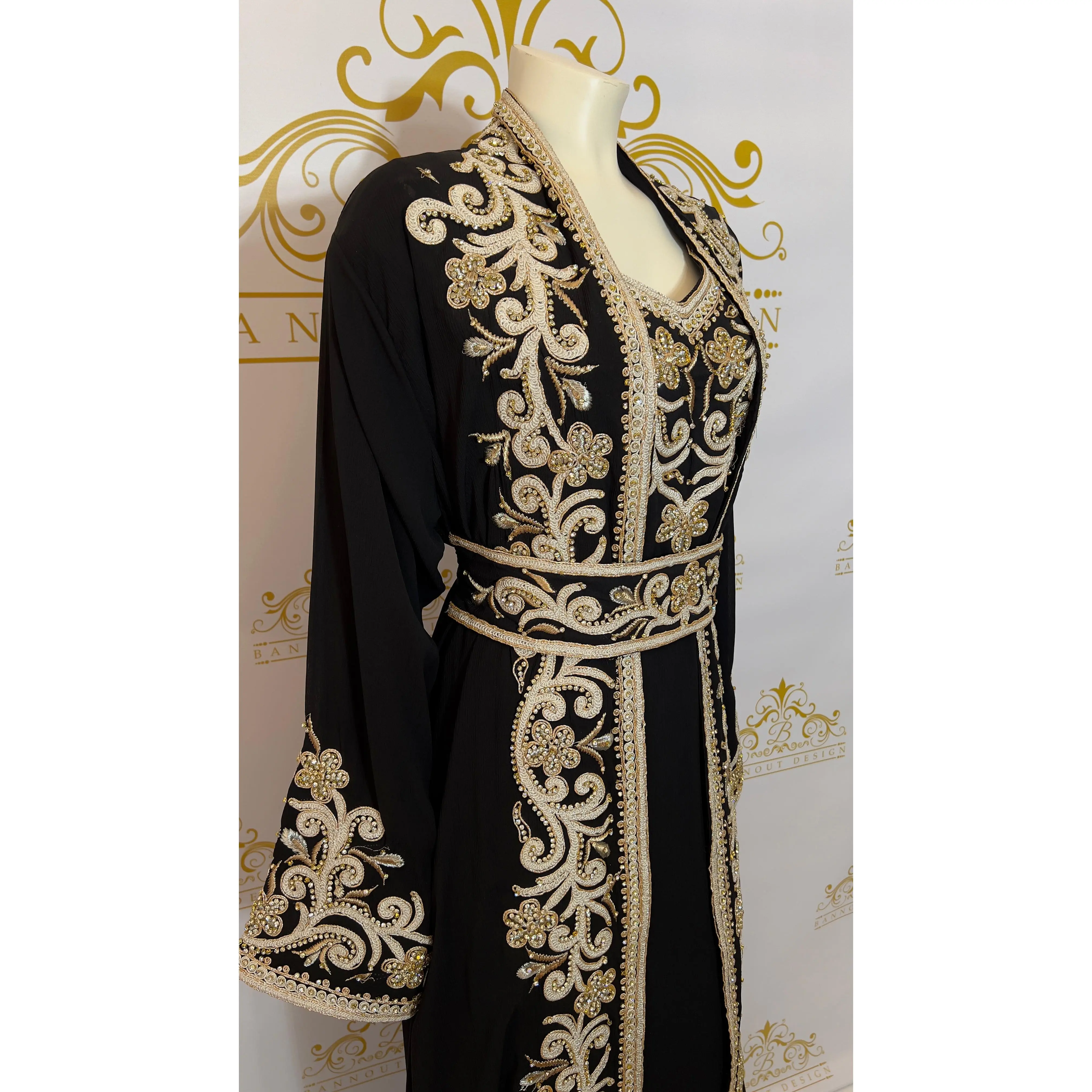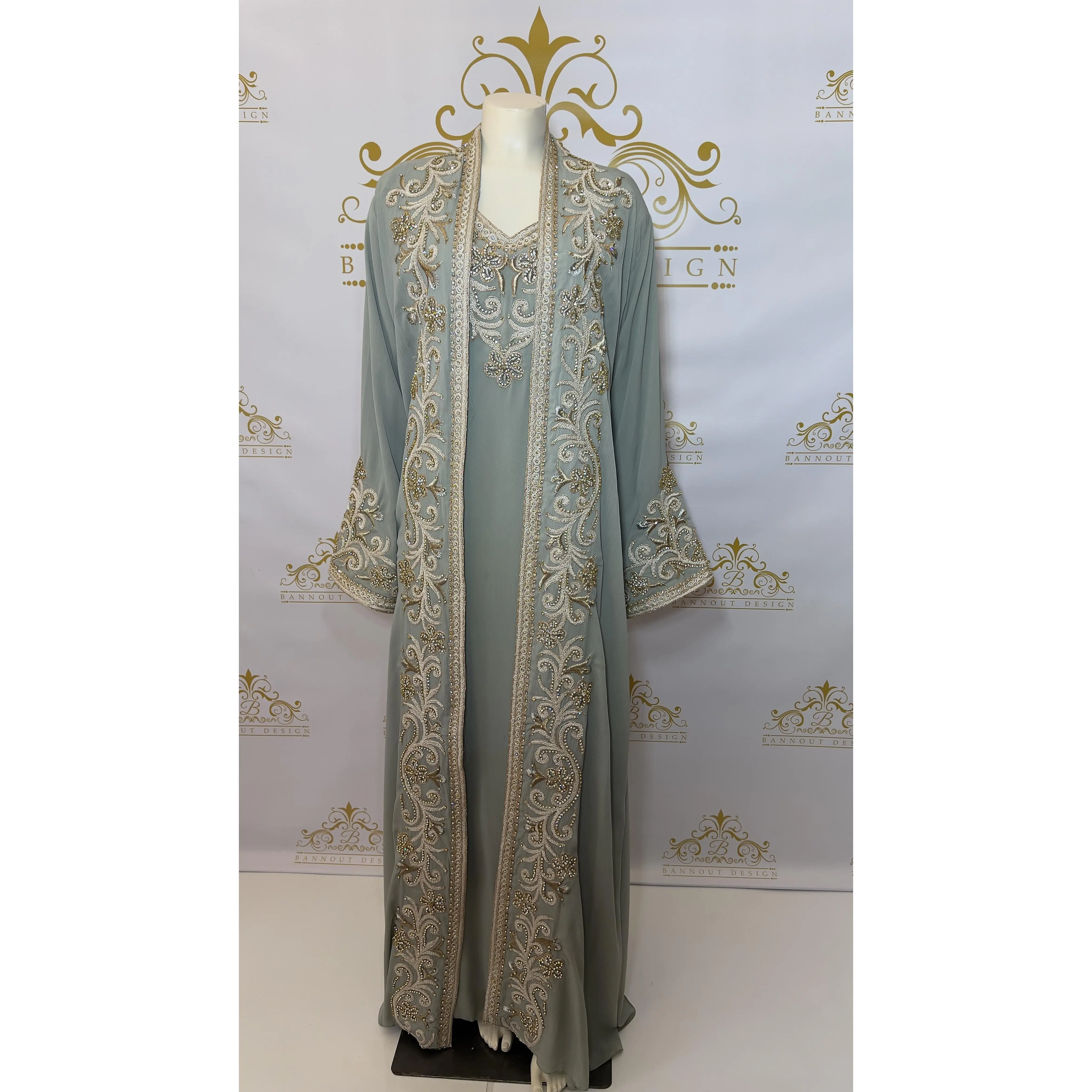 This Kaftan Abaya features a beautiful floral design with silver and gold embroidery and beads. The intricate detailing adds a touch of elegance to this 3-piece set. Made with quality materials and expert craftsmanship, this Kaftan Abaya is perfect for special occasions and everyday wear.