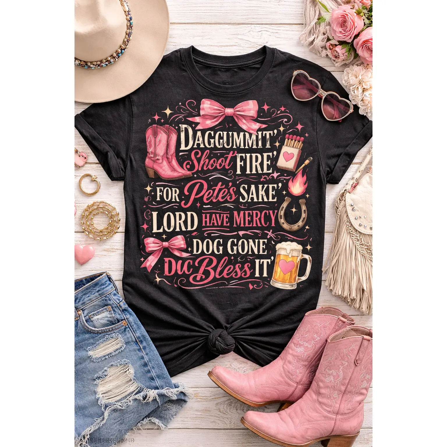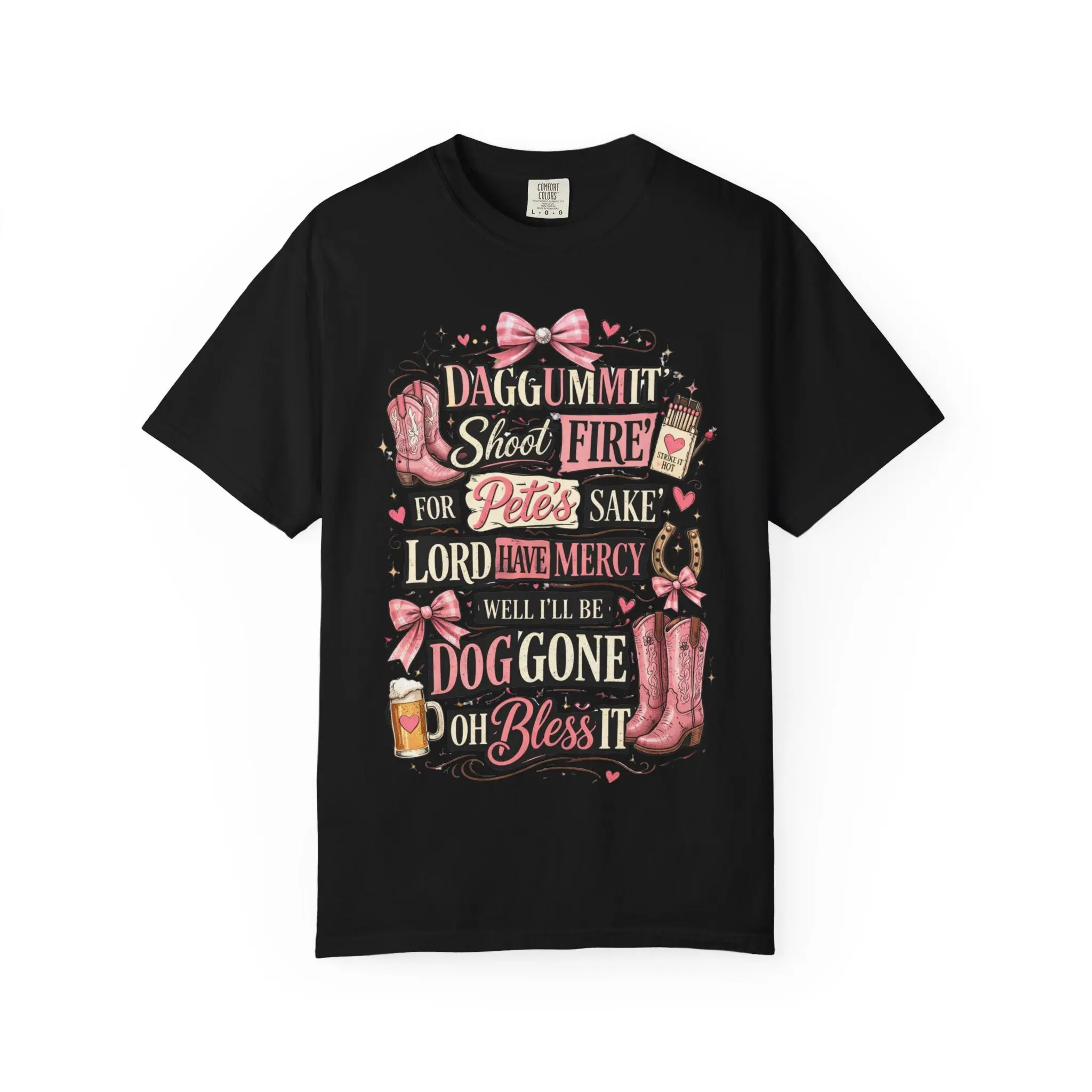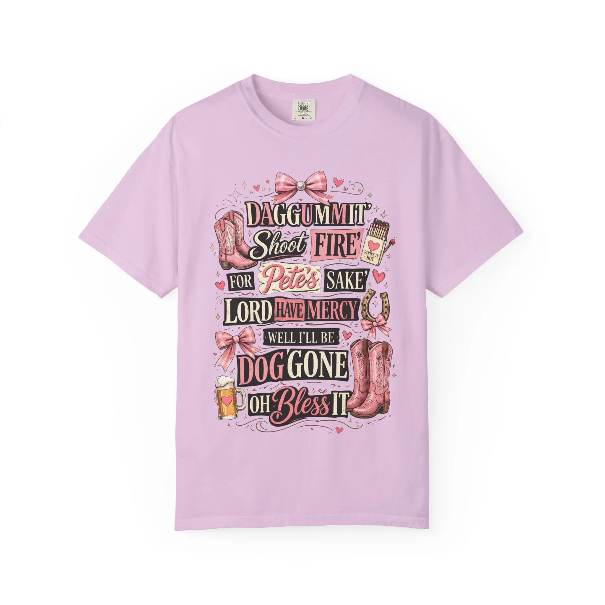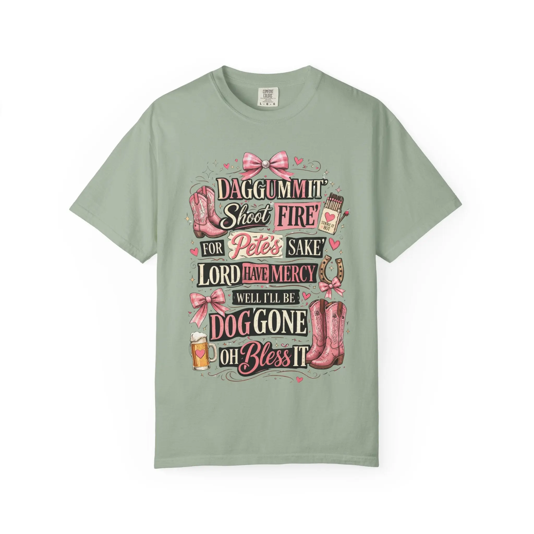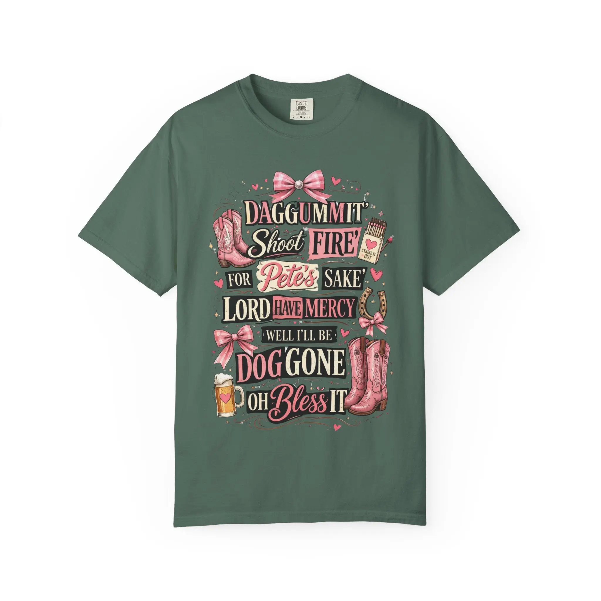 This soft, garment-dyed tee brings a playful, Southern‑charm attitude to everyday wear. The relaxed, heavyweight cotton feels broken‑in from day one, with a textured color depth from post‑construction dyeing. The whimsical, typographic design—accented with boots, bows, and little hearts—reads like a laugh shared over sweet tea on a porch swing. Wear it to run errands, sit through a backyard cookout, or pair with denim and boots for a casual country‑style look that reads friendly and familiar. The roomy cut and sturdy double‑needle seams mean this shirt moves with you and stands up to repeated wear and washings, while the wide size range and classic cut keep it approachable for many body types.