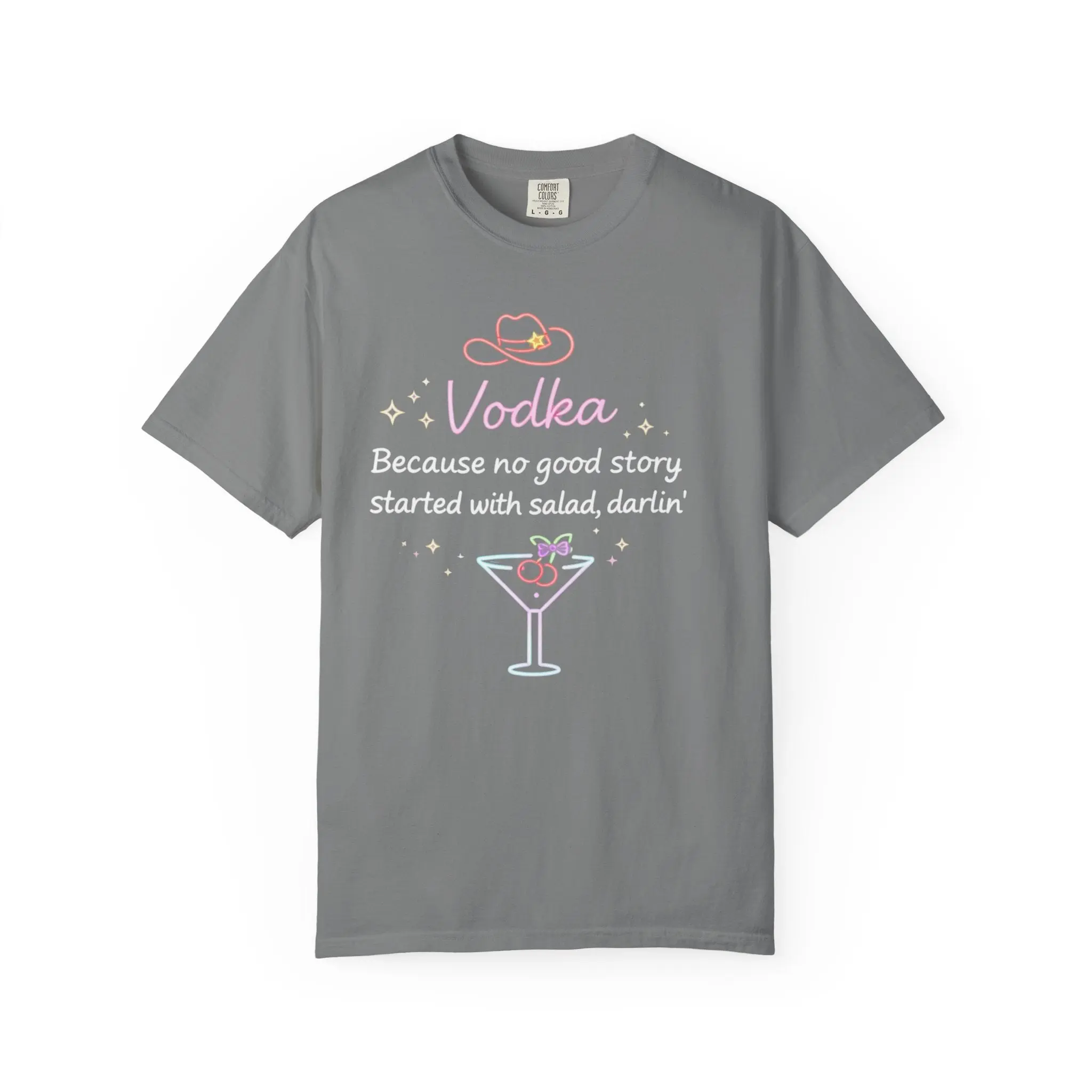 A laid-back, garment-dyed tee that tells a story before you even say hello. Soft, worn-in color and a relaxed fit create that easy, lived-in feel — like your favorite barstool after the first round. The front artwork mixes playful Western accents (cowboy hat and boots) with a cheeky cocktail motif and the line “Vodka, because no good story started with salad, darlin’.” It’s the kind of shirt you reach for when you want to be lighthearted, a little flirty, and ready for low-key nights: backyard bonfires, girls’ nights, casual line-dancing, or roadside diner stops on a summer road trip. The heavyweight cotton and garment-dye process give it durable softness and depth of color that only gets better with wear. Available in a wide range of colors and sizes, this shirt sits comfortably in the wardrobe of someone who values humor, a rustic vibe, and clothes that feel like old friends.