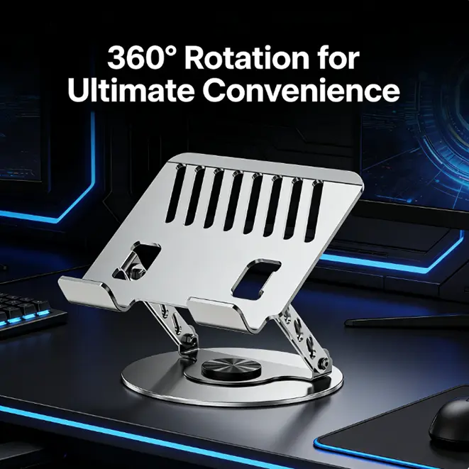 ·【360° Full Rotation & Foldable Design】 This all-metal laptop stand supports full 360° horizontal rotation and multiple-angle folding, allowing you to effortlessly adjust your screen to the perfect viewing position—ideal for presentations, shared viewing, or ergonomic typing.