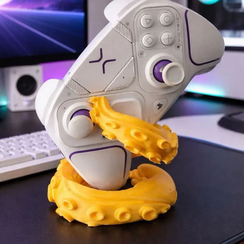 This image features a sleek white gaming controller held by a bold, yellow octopus tentacle stand, creating a unique and eye-catching design. The glossy tentacle wraps around the base and grips the controller, adding a creative, almost futuristic ocean-inspired vibe.