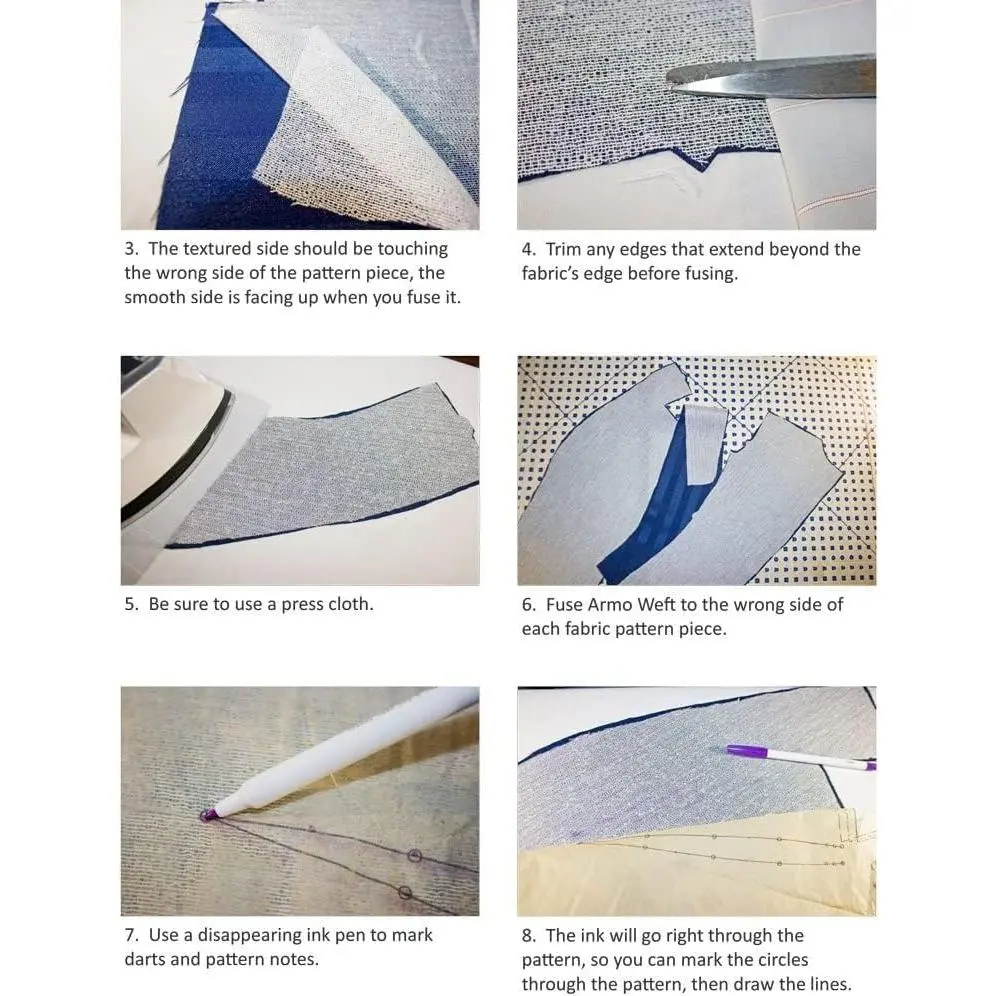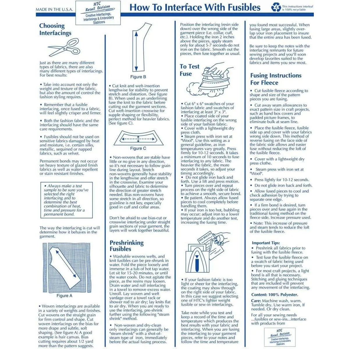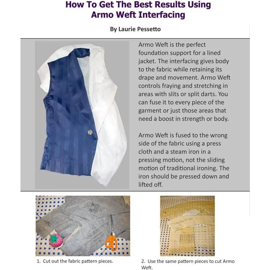 MADE IN USA: With Armo Weft HTC88002 - White - 20 Inches Wide, Interlining/Interfacing, creating professional-looking garments is easy!This fusible fleece interfacing for bags is made in the USA, is easy to use, and helps make sewing and crafting projects look polished.Our fusible interfacing also offers superior stability and light padding, making the finished product look sharp and professional.With the help of this product, create great-looking garments with ease.Extra Support: This product is fusible interfacing for sewing, providing added stability and structure to fabrics.It resists stretching and distorting, helping to create professional-looking projects with ease.The interlining/interfacing reduces seam allowance shrinking and makes fabrics stronger, more durable, and easier to sew.It is 20 inches wide and available in white, a good addition to any sewing project.Speed Up Sewing: Make soft tailoring easier and faster with Armo Weft HTC88002 - White - 20 Inches Wide, Interlining/Interfacing.This white interlining fabric is a medium-weight, weft insertion material that provides a smooth, sharp edge and form-fitting drape.It makes tailoring projects quicker and gives a professional, pristine finish.This superior woven fusible interfacing ensures your tailoring looks great every time.Smooth Finish: This sewing interfacing offers a smooth, consistent finish and is made of 60% polyester and 40% rayon.Its qualities make it well-suited for providing superior strength, resilience, and shape retention to a variety of textile products.Its weft construction creates a uniform, consistent consistency that gives an even, smooth finish.The result is a fabric that is great for achieving a precise and consistent finish.Structured Shape: Armo Weft HTC88002 is an interlining/interfacing fabric that provides structure and support to complex garment shapes. It is 20 inches wide and can be applied using an iron-on technique. This premium quality knit interfacing is lightweight yet strong, ensuring that it holds the shape of the garment perfectly, even after multiple washes. Adding structure to complex garment shapes, this fabric interfacing iron-on is essential for garment construction.