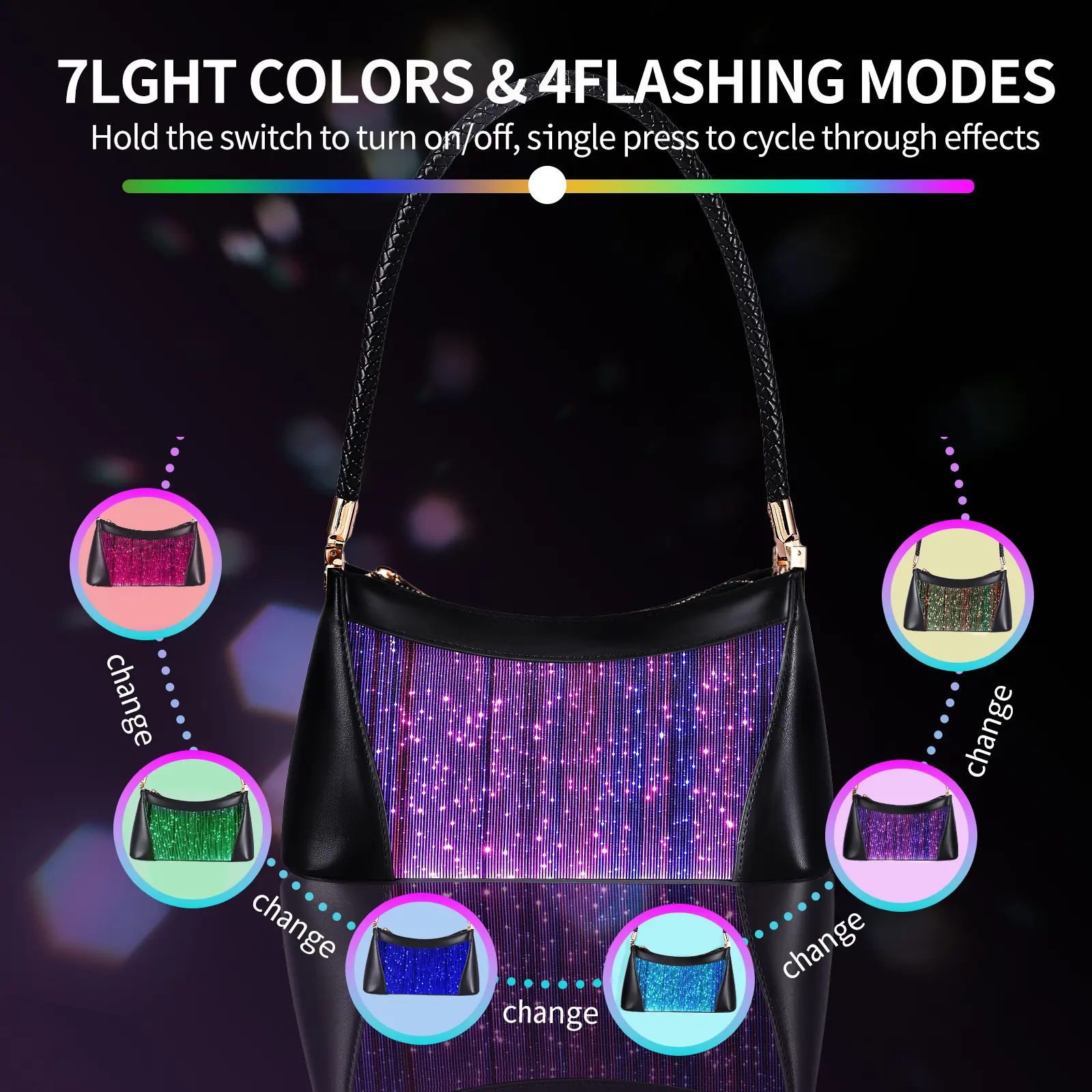 Stand out at every night out with this futuristic LED shoulder bag! Crafted with premium fiber optic fabric, it glows with 7 vibrant colors (red, green, blue, cyan, purple, warm white, gradient) and 4 dynamic modes, including music-sync that flashes to the beat.