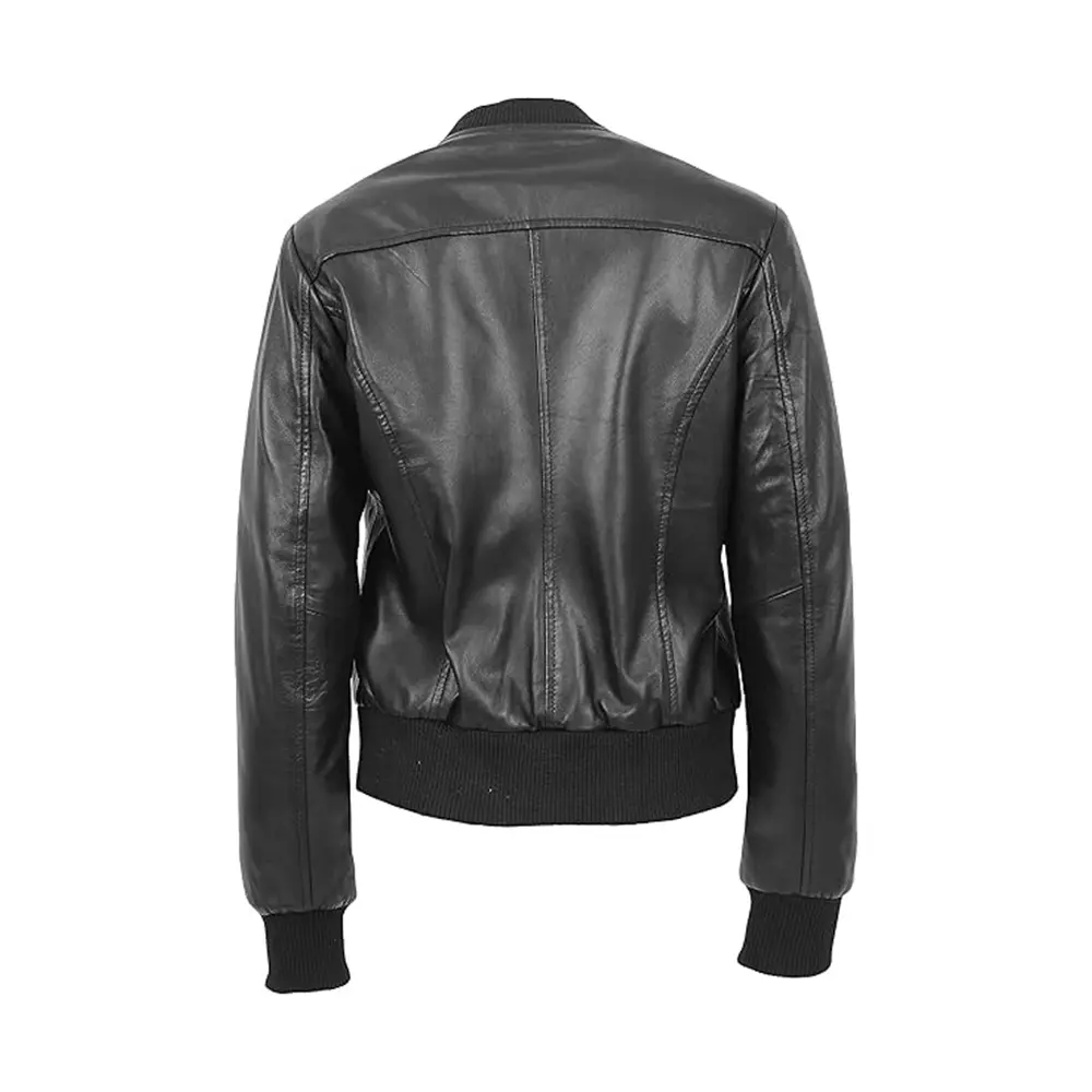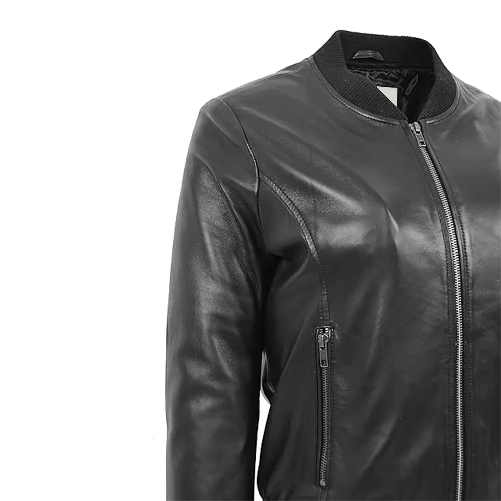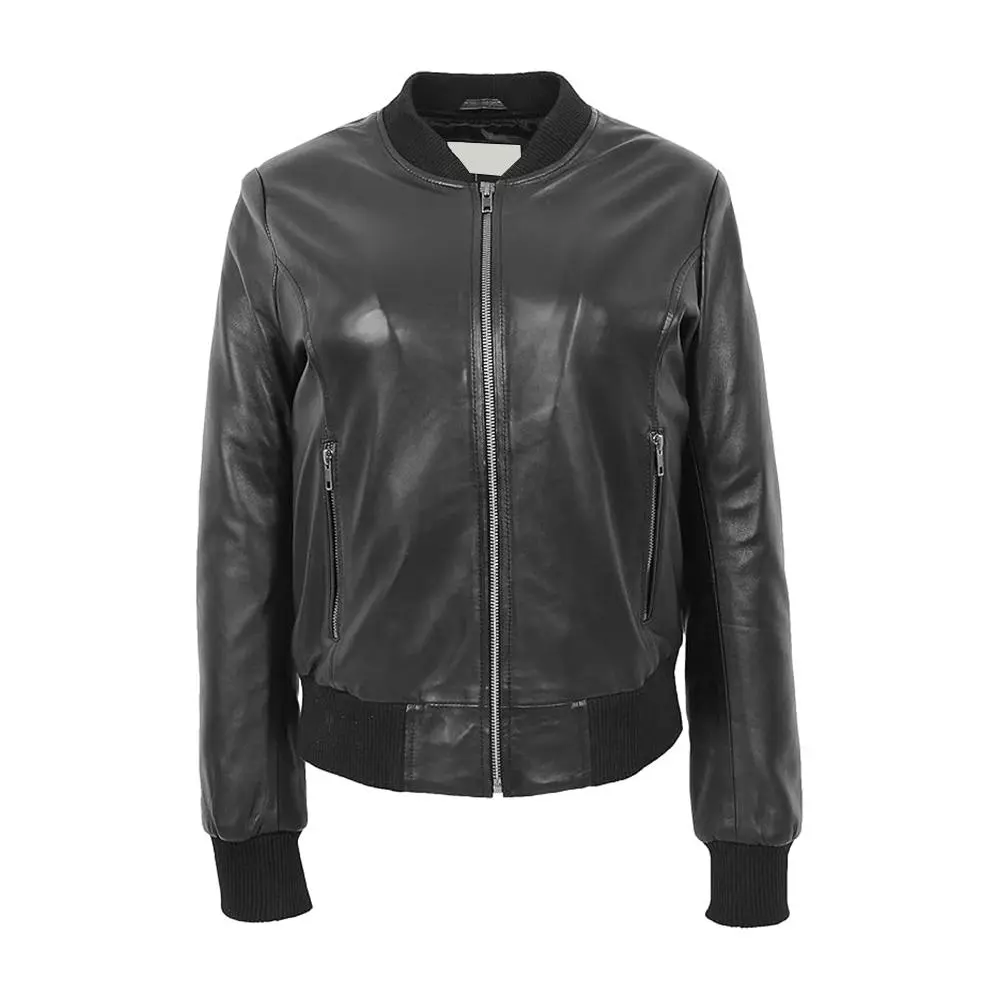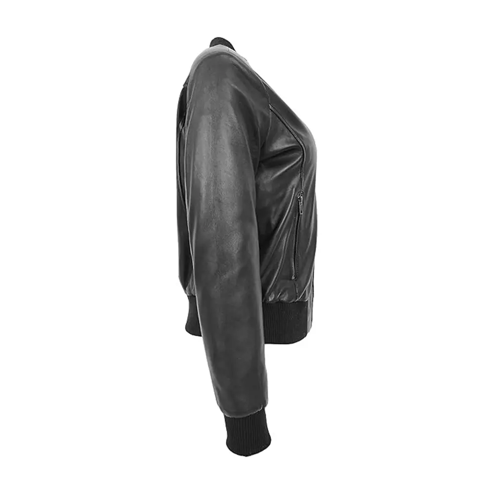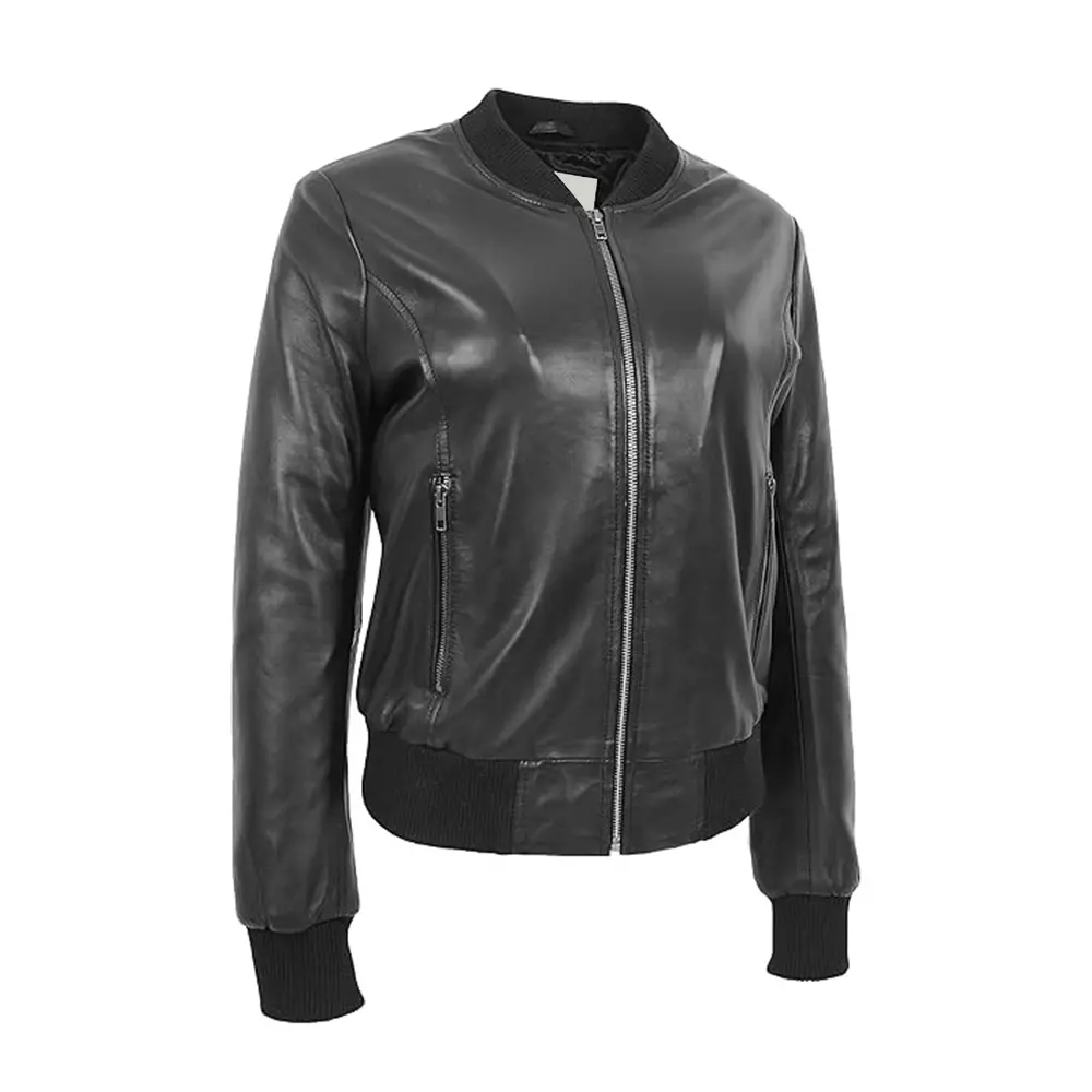 Women's Classic Leather Bomber Jacket, Black, Ribbed Collar and Cuffs, Full Zip Front by Hide Crafts