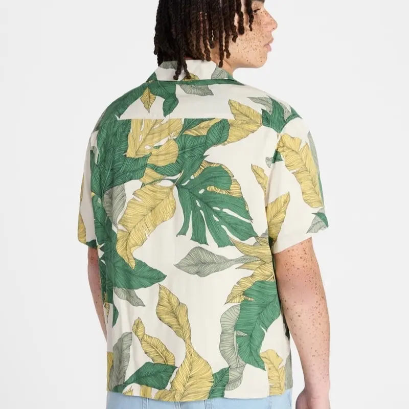 This short sleeve shirt is designed for summer. The tropical leaf print adds a fresh, natural vibe. It's a versatile piece for various casual occasions. The green and yellow leaves create a lively, eye-catching appearance. Stay cool and fashionable this season.
