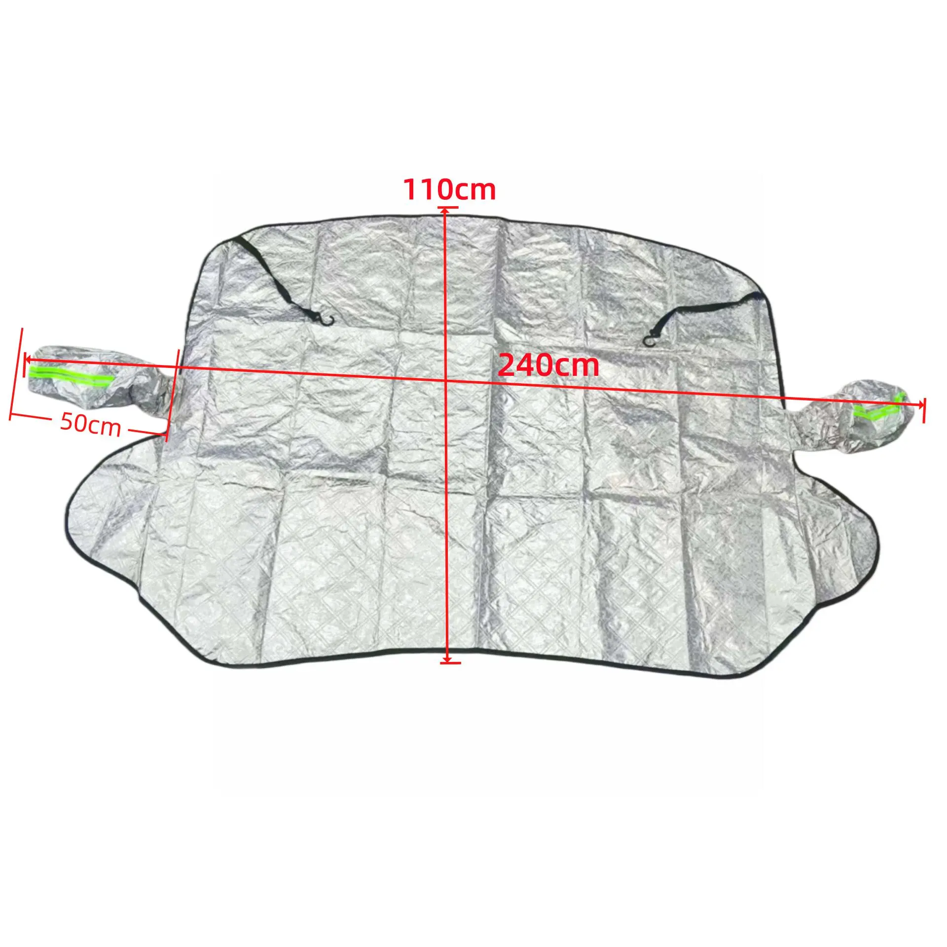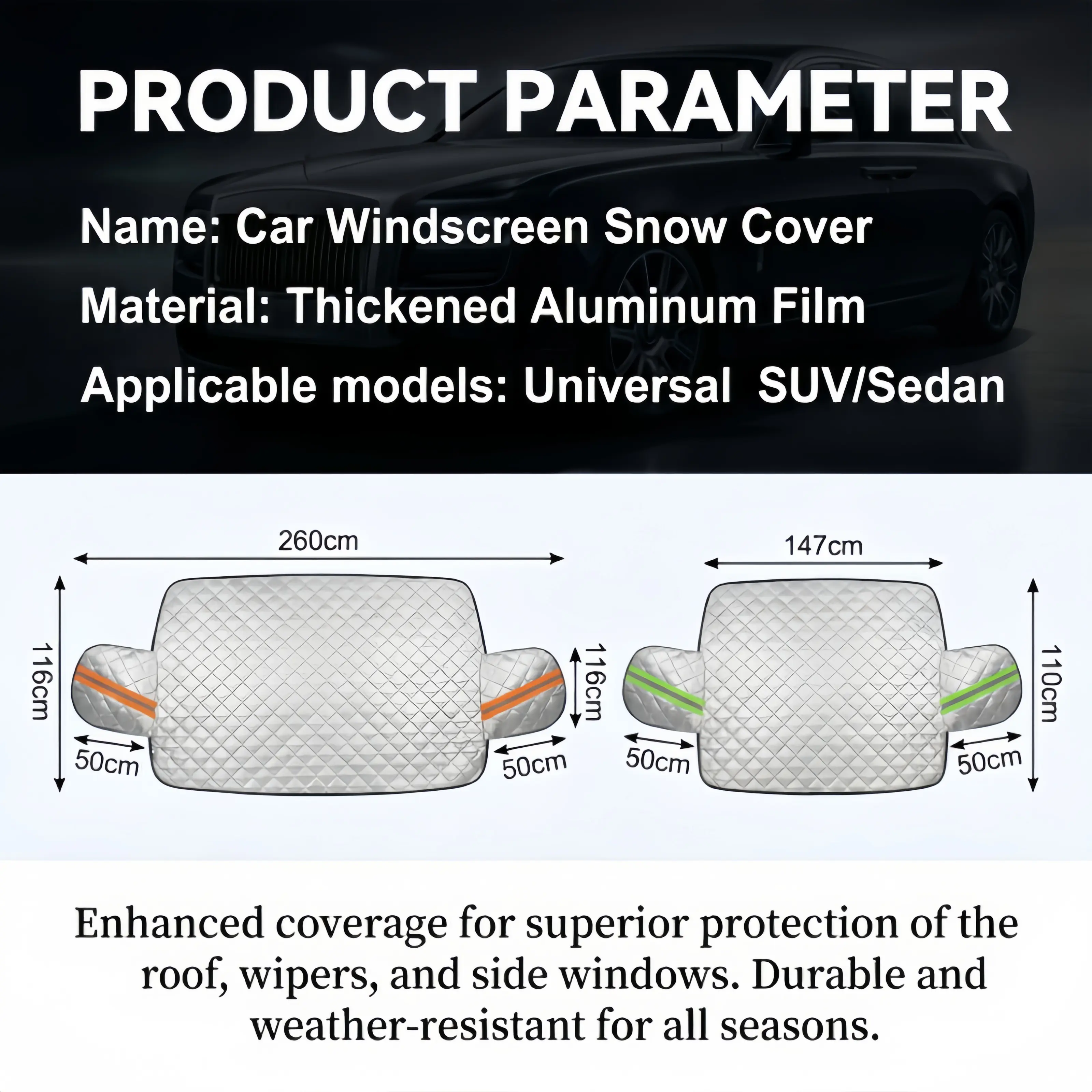 The side mirrors part of the windshield cover has reflective strips to enhance the safety of parked cars at night.