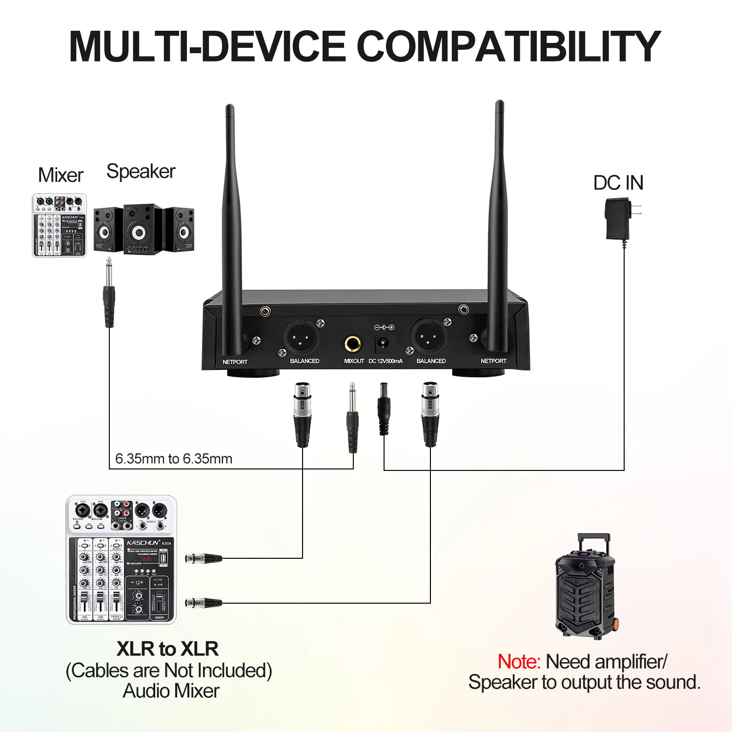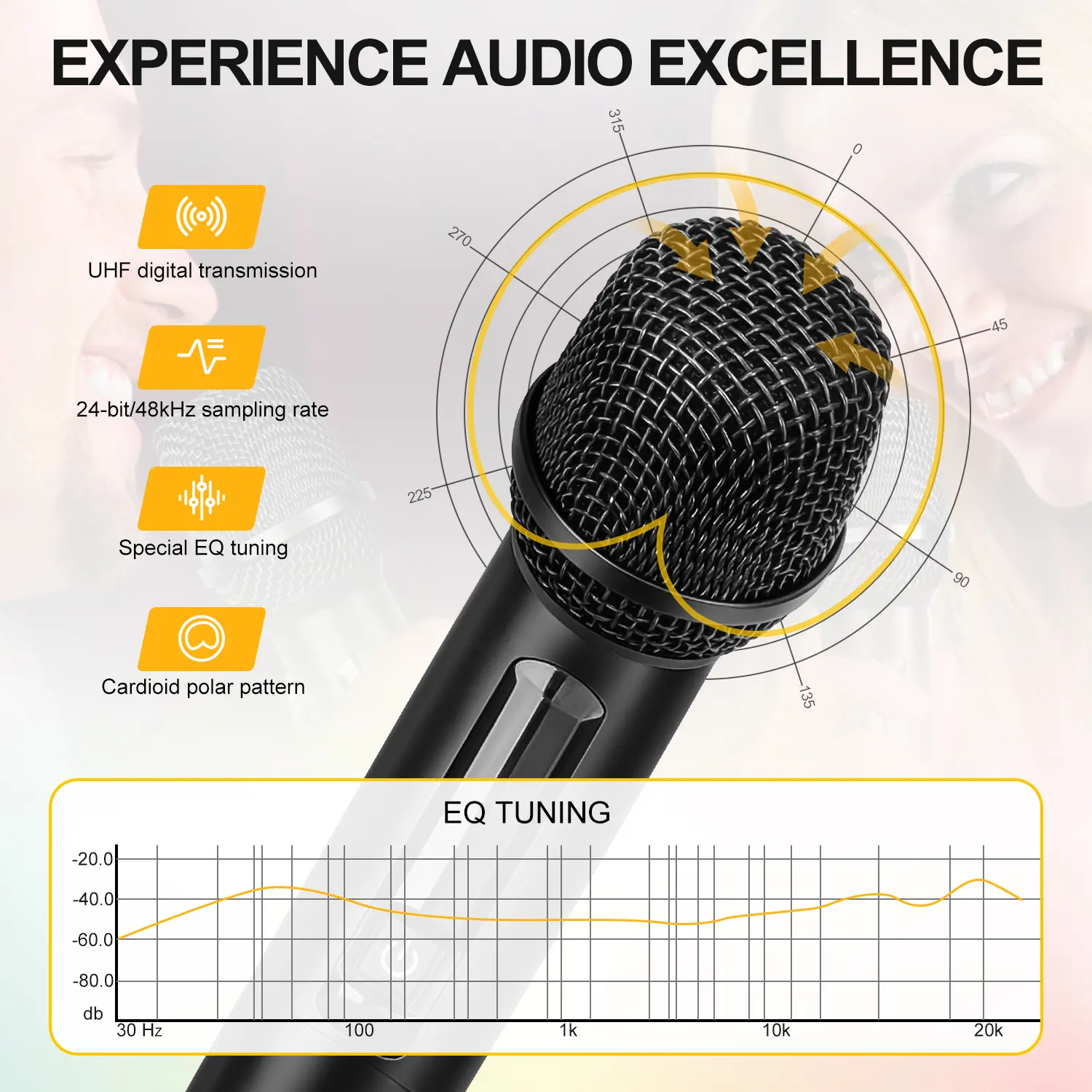 KASCHUN offers a dual-channel wireless microphone system with 2 handheld dynamic mics. It boasts a 200ft range, 24-bit/48kHz audio, and a cardioid polar pattern. Ideal for karaoke, live performances, church, weddings, and parties. Enjoy seamless audio in large venues, outdoor events, or wedding ceremonies.