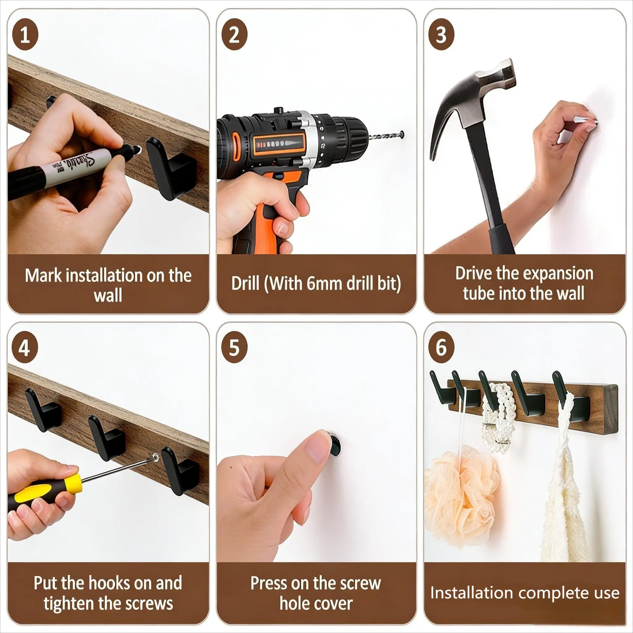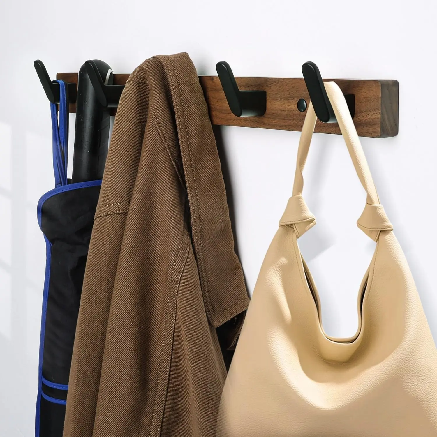 ·【Load-bearing Capacity】The wall hook adopts a sturdy wall-mounted design to ensure stability without worrying about falling off. The combination of solid walnut and durable aluminum hooks can bear up to 55 pounds. Easily hang heavy tools, jackets and other items. The hook is designed with a 45° angle to prevent the keychain from slipping when hanging. The curved edge protects clothing and skin from scratches.