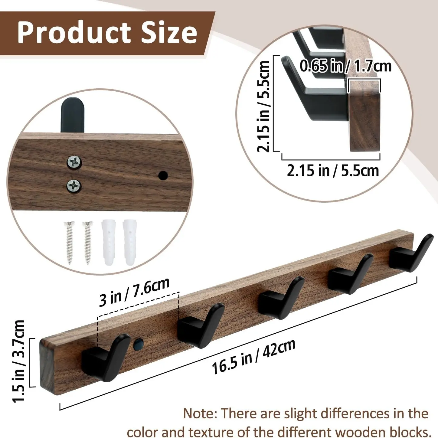 Coat Hooks Wall Mount, Wall Mounted Coat Rack with 4/5 Aluminum Hooks for Hanging Backpacks, Hats, Dog Leashes, Towels, Keys, Walnut Wood Wall Hooks for Entryway, Bathroom, Bedroom