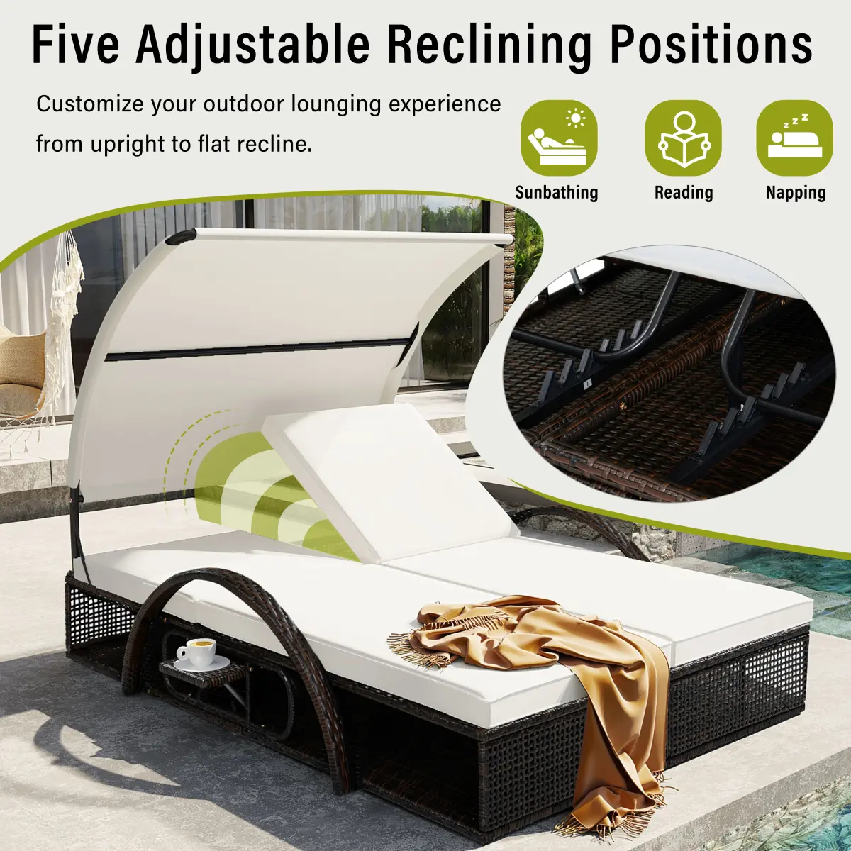 Customize your outdoor lounging experience from upright to flat recline, finding the perfect position for sunbathing, reading, or napping.