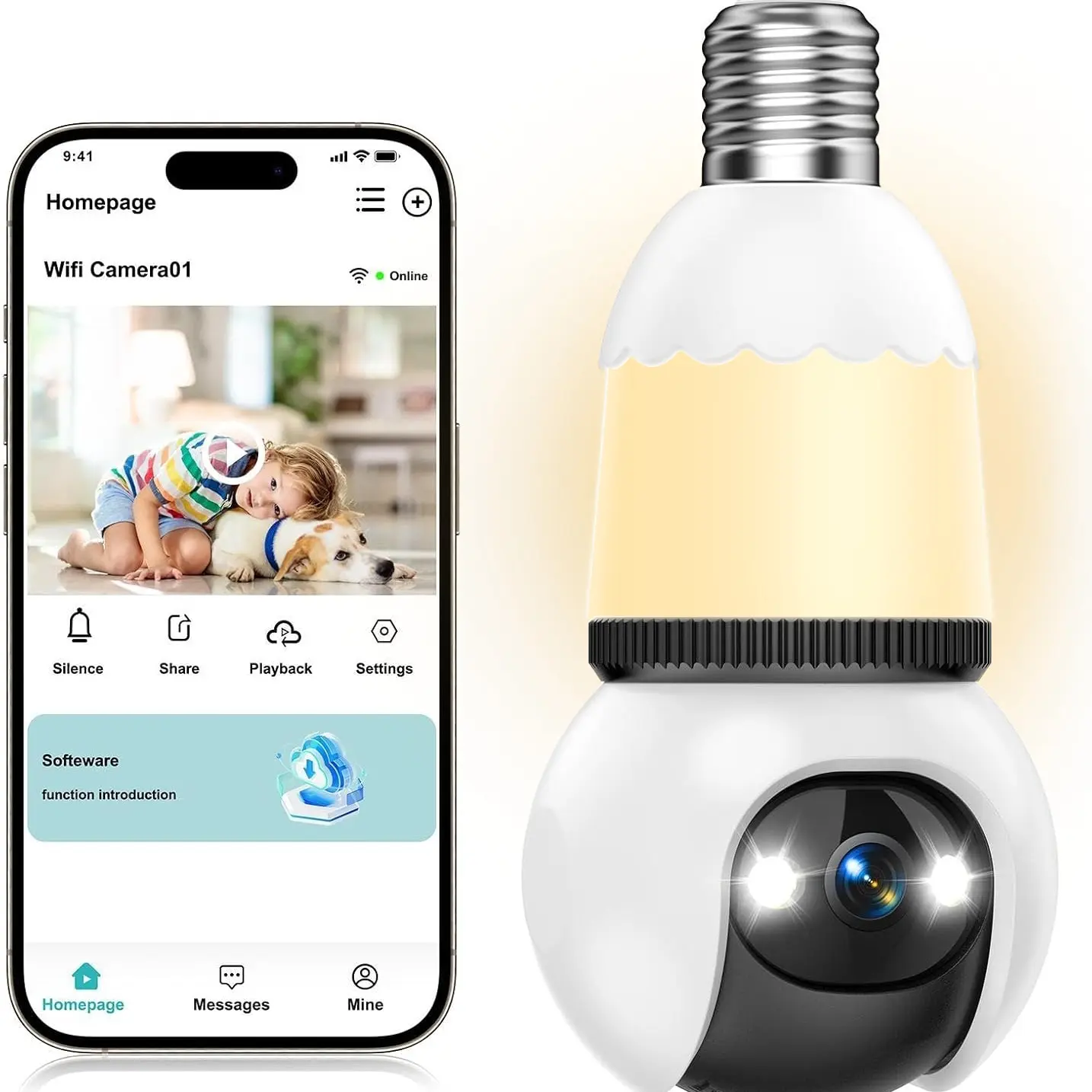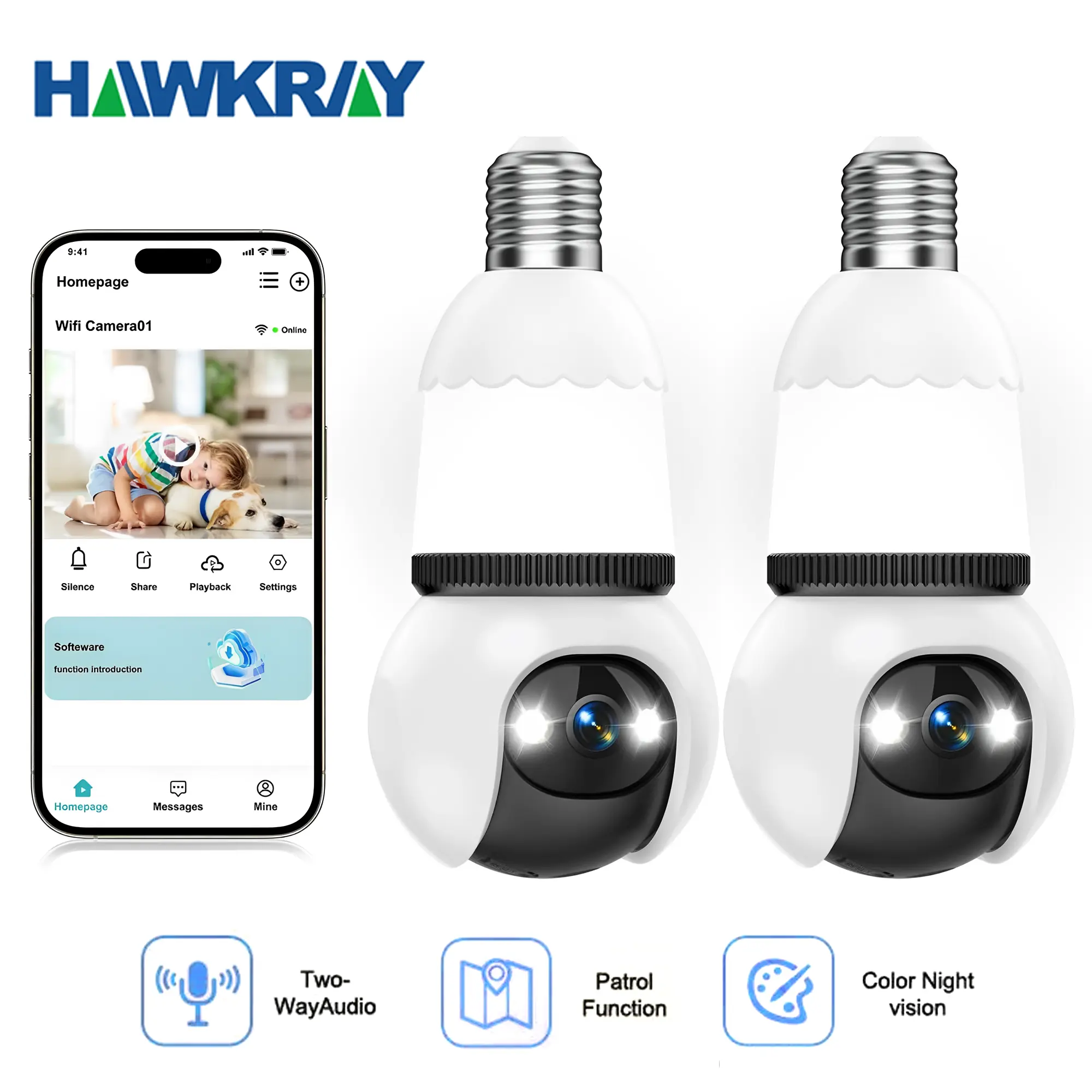 Image Description- Light Bulb Camera: The image shows the Hawkray Infrared Night Vision 5G and 2.4GHz Wireless Indoor/Outdoor Security Camera in a light bulb design.- Mobile App: The image also shows the mobile app interface for the camera, including options for silence, share, playback, and settings.