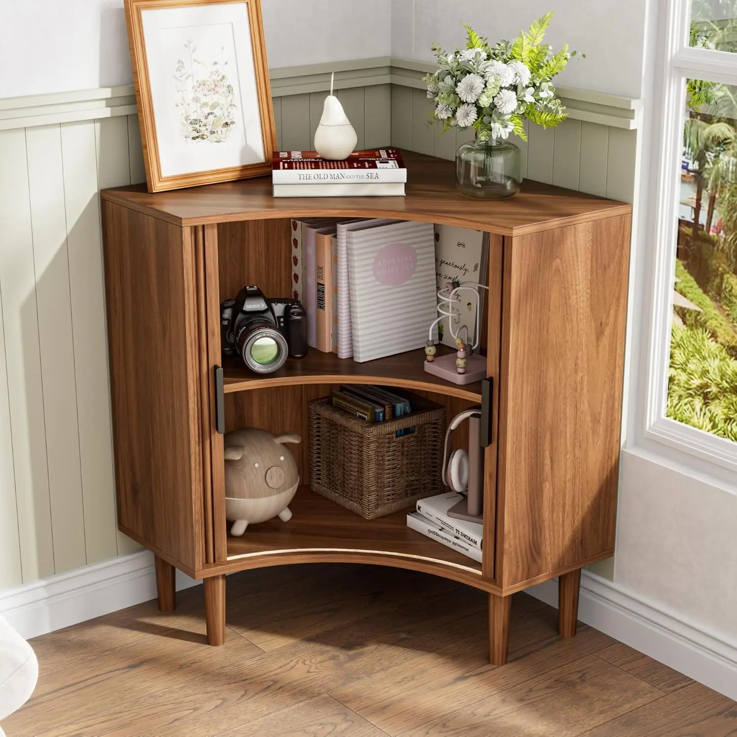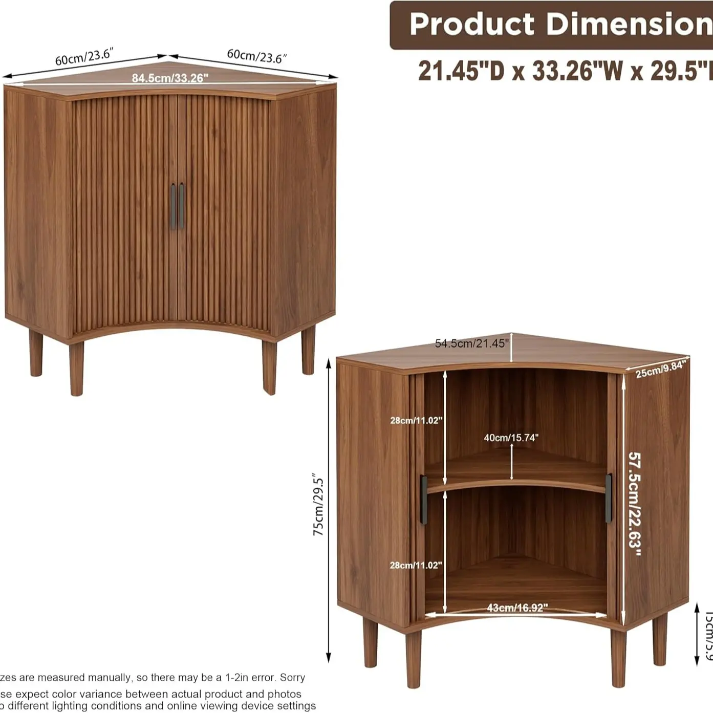 ·Large Capacity Corner Cabinet: The total size of our corner cabinet is 33.26"(W) x 21.45"(D) x 29.5"(H) . The compact design of the pointed corners can fit tightly into any corner and make full use of your corner space. This storage cabinet has a spacious desktop and also includes 2 sliding doors. The internal storage space is also equipped with adjustable and removable shelves, which can accommodate most items such as books, towels, tableware, decorations, etc., for flexible storage