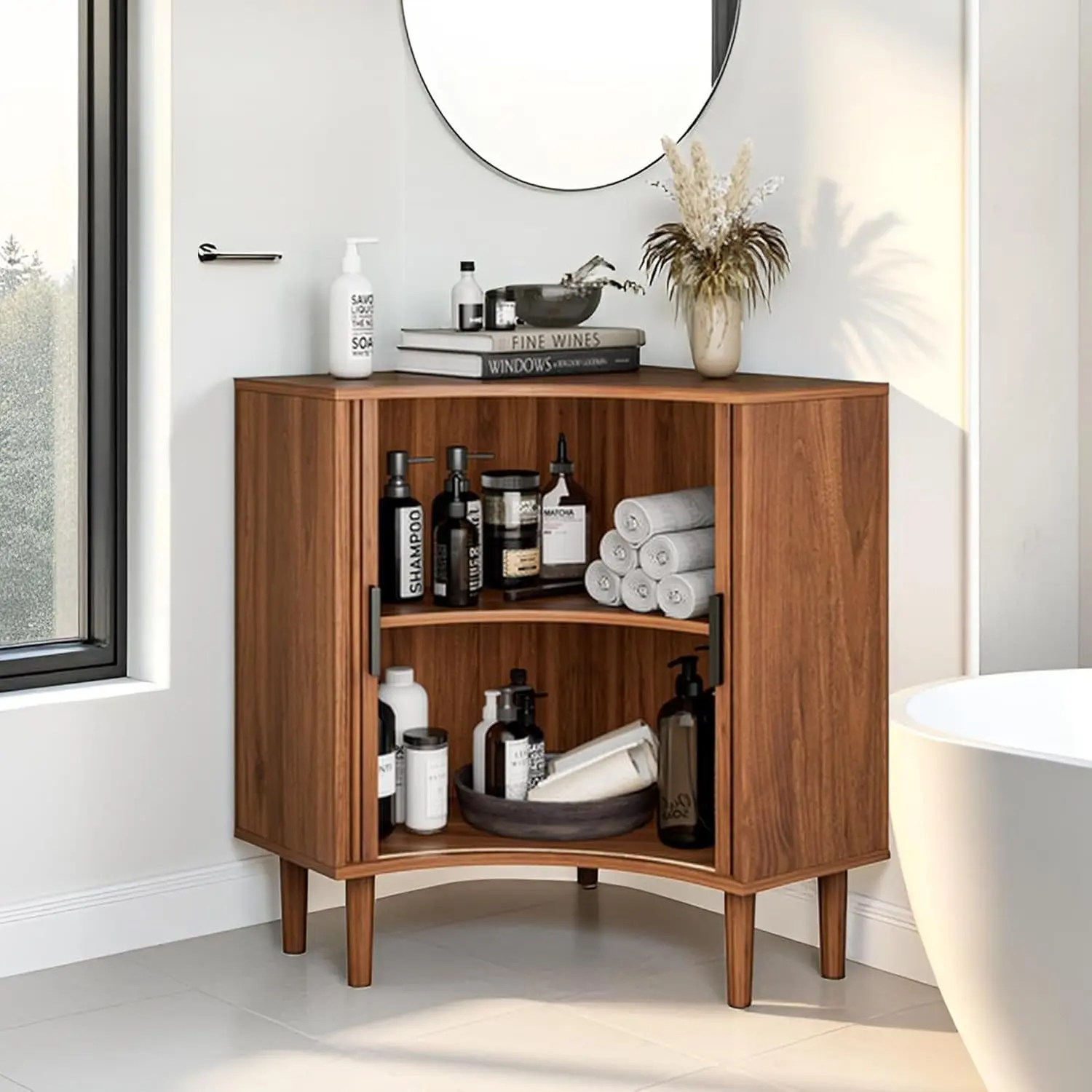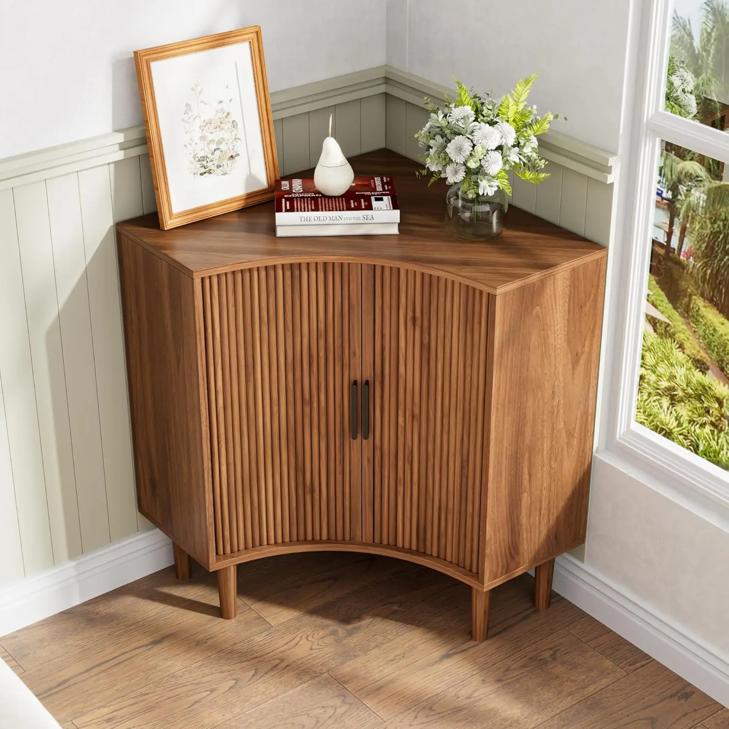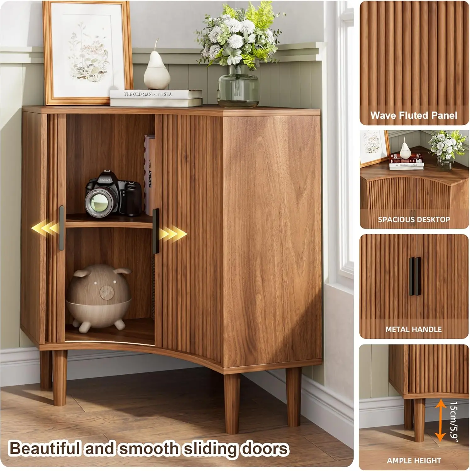 ·Modern Corner Cabinet: The unique rounded fluted sliding door with black metal handle design is more distinctive, adding a unique style to this simple corner cabinet. The stylish curved design embodies the timeless charm of the Mid-Century Modern style, adding a beautiful and charming touch to your living room, kitchen and bathroom and perfectly integrating into the space