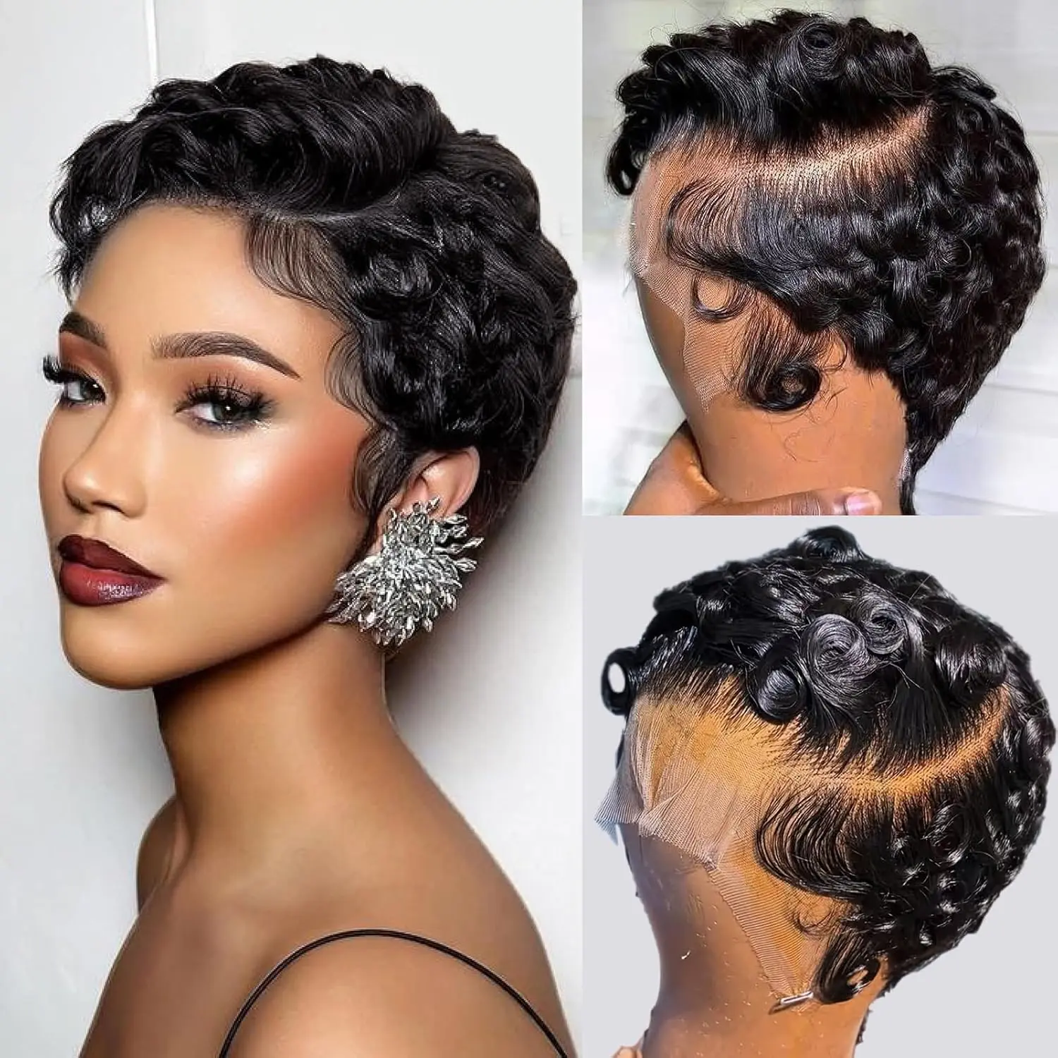 Curly Pixie Cut 13x4 Short Lace Front Wig Human Hair Wigs 13x4 HD Lace Frontal Wigs Short Layered Curly Wig Deep Wave Pixie Cut Human Hair Wigs for Black Women Natural Black