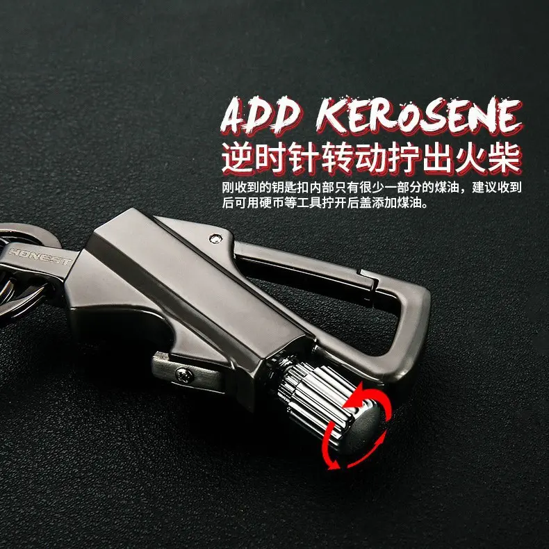 Multi-functional three-in-one metal tool lighter keychain with bottle opener. It is reusable and suitable for various occasions such as outdoor activities, travel, camping, parties, etc.