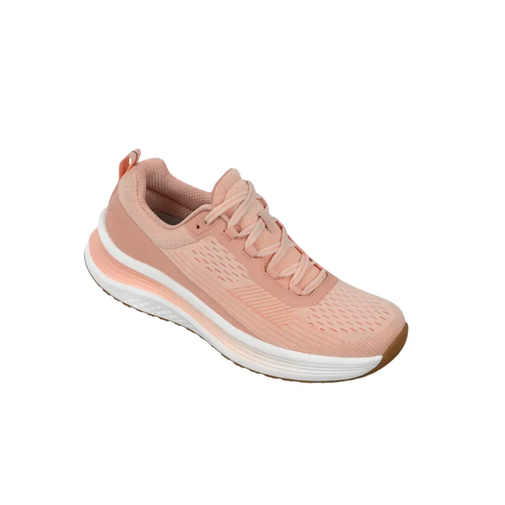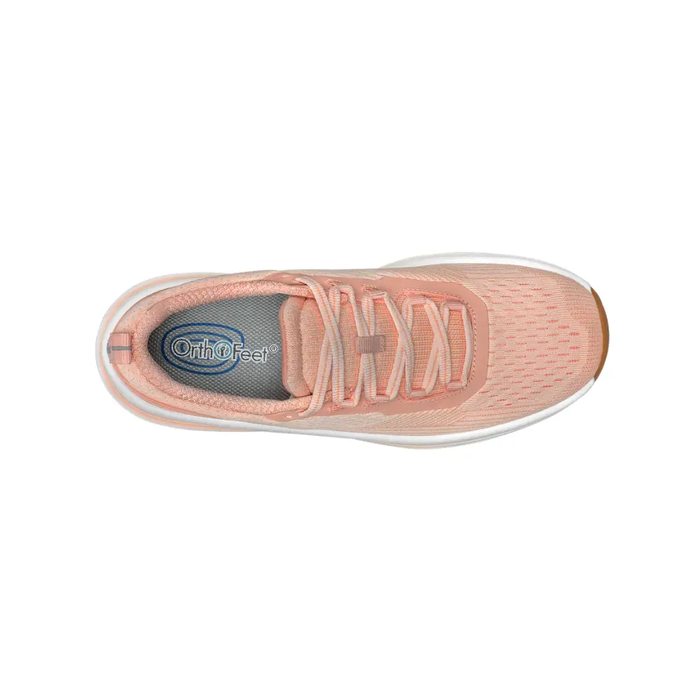 Orthofeet Relay - Women’s Running Shoe - Peach is a cushioned, breathable running and walking shoe designed for comfort, support, and a relaxed fit. It features a lightweight synthetic fabric upper, premium orthotic insole, extra depth, wide toe box, and a rubber outsole for traction and stability.