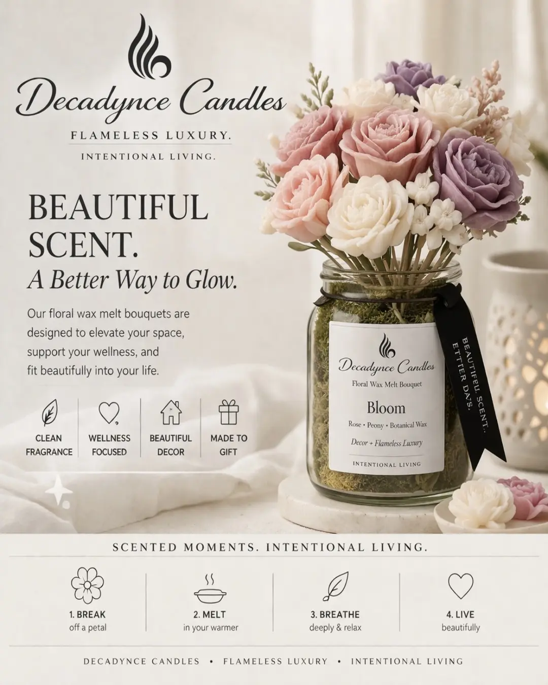 Bring beauty and fragrance together with Bloom, a handcrafted floral wax melt bouquet from Decadynce Candles. Designed for those who love elegant home fragrance without the flame, this unique arrangement combines decorative wax flowers with luxurious scent for a truly elevated experience.