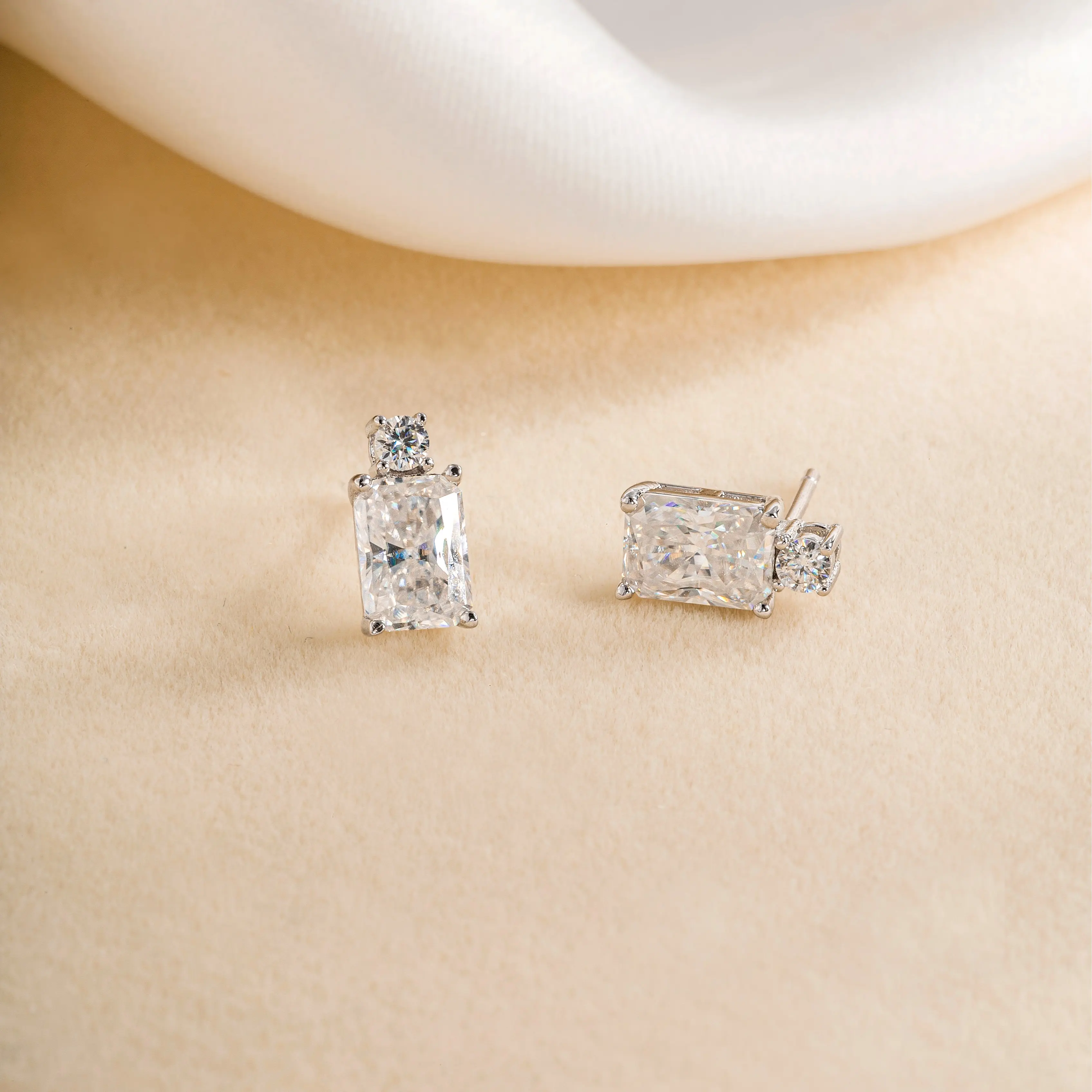 These radiant cut moissanite earrings are designed for those who appreciate bold elegance and refined brilliance. The elongated rectangular center stone creates a striking silhouette, enhanced by a delicate round stone above—adding balance, dimension, and extra sparkle.