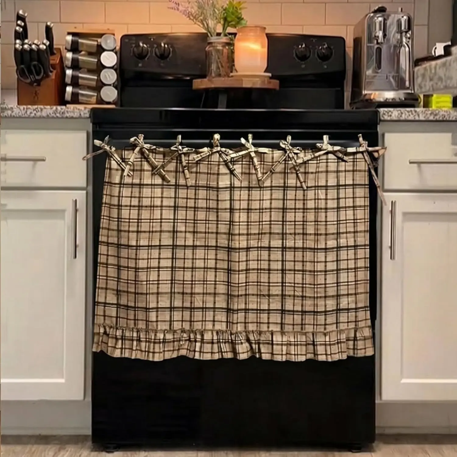 ·【 Easy Install Oven Curtain Tie Top Design】This oven curtain tie top features adjustable ribbon ties for quick setup. Designed as an oven skirt curtain for door, it attaches easily to most oven handles without tools, creating a soft gathered look while staying securely in place.