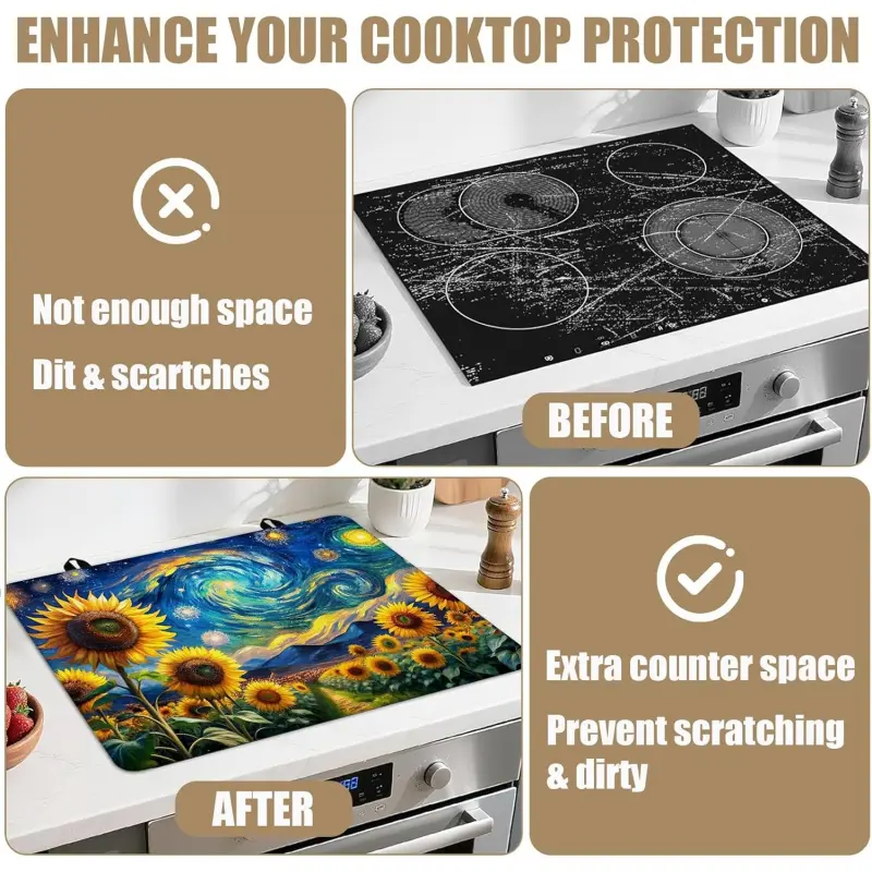 This large stove mat not only enhances your kitchen decor but also expands usable countertop space. It fits most electric/induction stovetops and curved edges, fully covering the stove surface while protecting both the appliance and countertop.