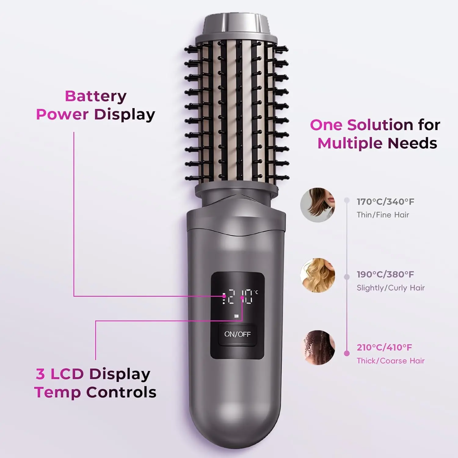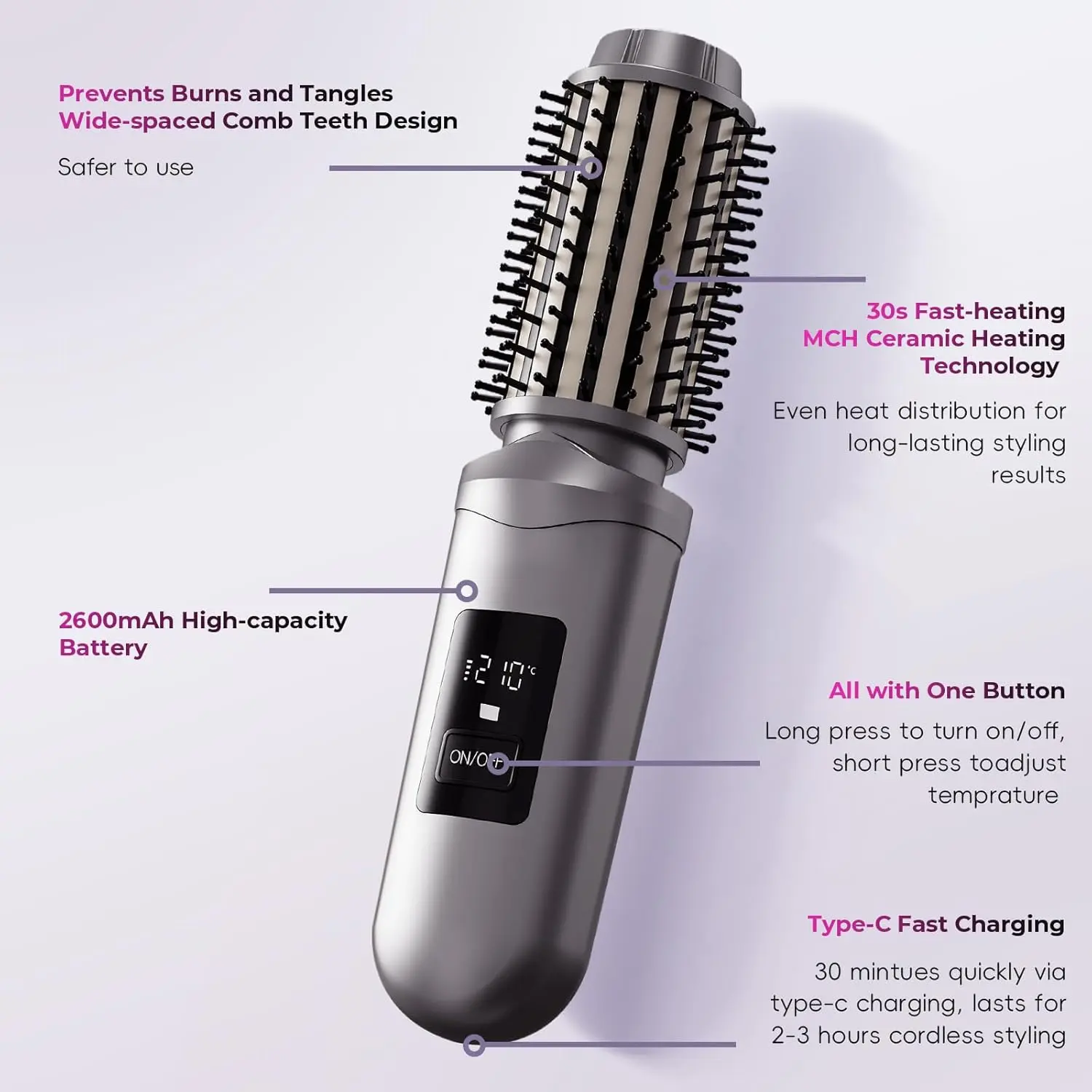 ·【30s Fast Heating & 3 Temperature Controls】 Long Press to Turn on/off. Powered by MCH ceramic heating technology, this cordless hair straightener brush heats up in just 30 seconds with even temperature control. Choose from 3 heat settings to style safely, reduce heat damage, and achieve salon-quality results.