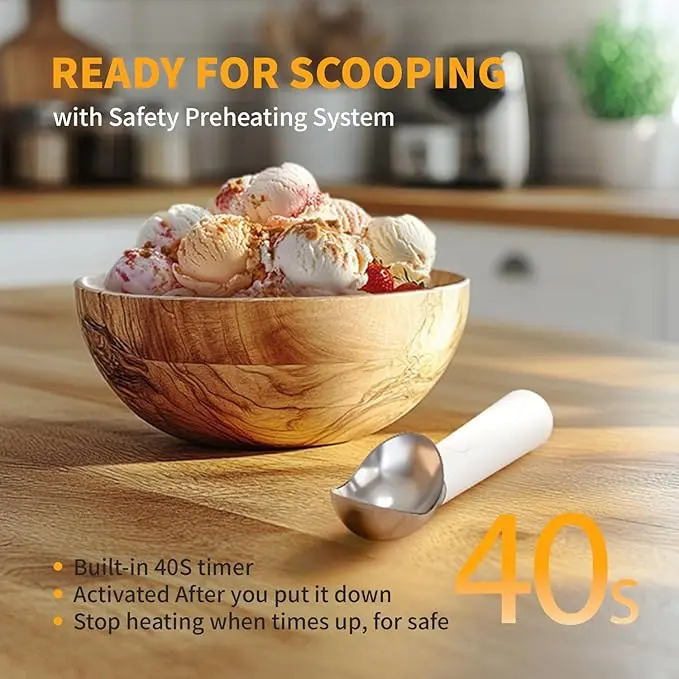 ·【Creative Heating Design】 This professional ice cream scoop features a grip sensor that activates the heating as soon as you lift it. It heats quickly to ensure smooth and even scooping every time. Avoid touching the scoop head when it reaches over 140°F to prevent burns. After use, let the scoop cool before placing it on wooden kitchen tools.