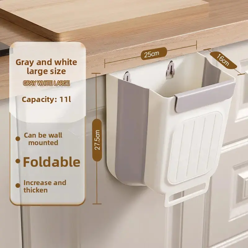 ️ Keep your kitchen counters tidy with this foldable hanging trash can. It attaches to cabinet doors, freeing up floor space. Easy access while cooking ensures convenience. Perfect for small kitchens, it folds flat when not in use, saving storage space. Upgrade your kitchen's tidiness effortlessly!