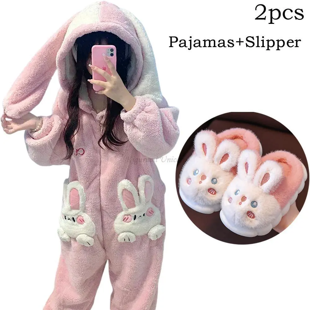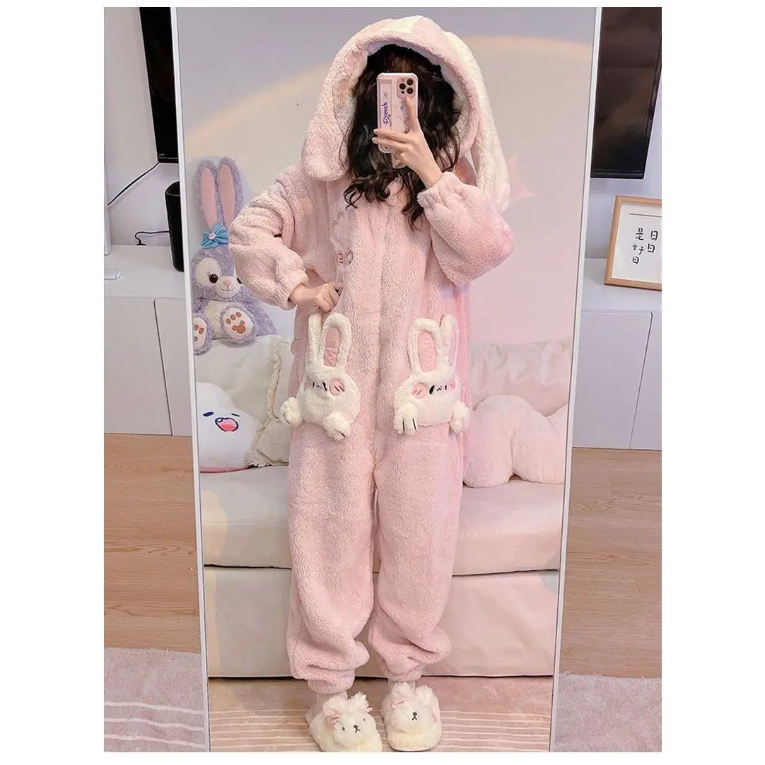 Coral Velvet Onesies Women Cute Rabbit Kigurumi Unicorn Preppy Cartoon Hooded Kawaii Thicker Winter Warm Cotton Pajamas Homewear