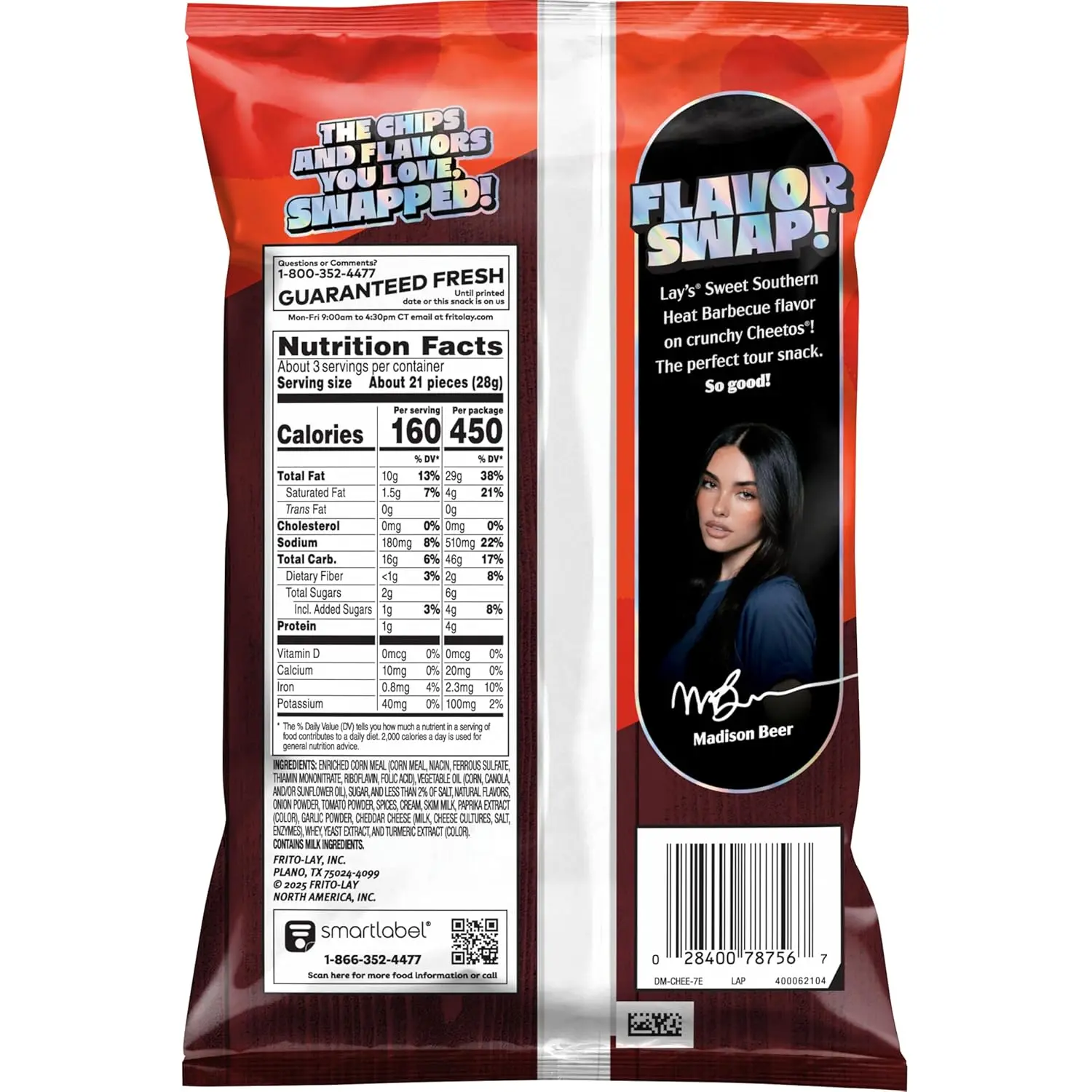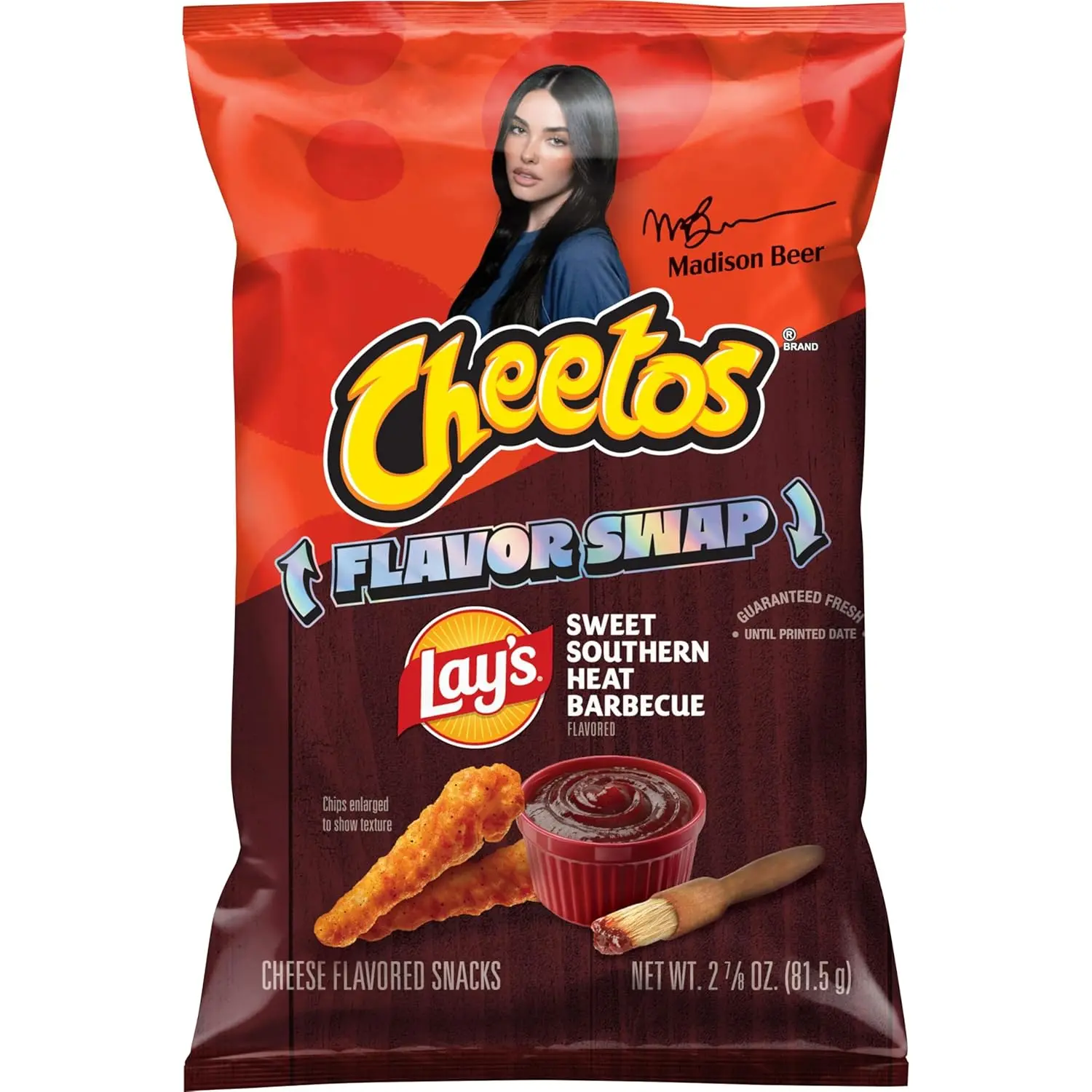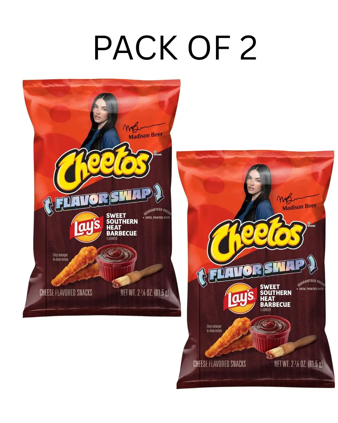 ·Includes 2 (2.875 oz each) single serve bags of Cheetos Crunchy Cheese, Lay's Sweet Southern Heat Barbecue flavor