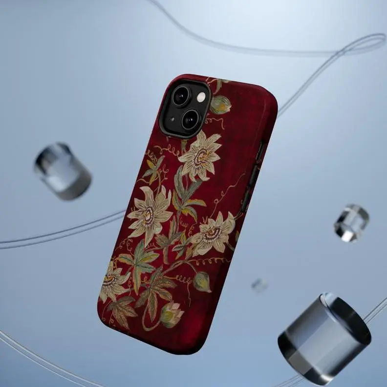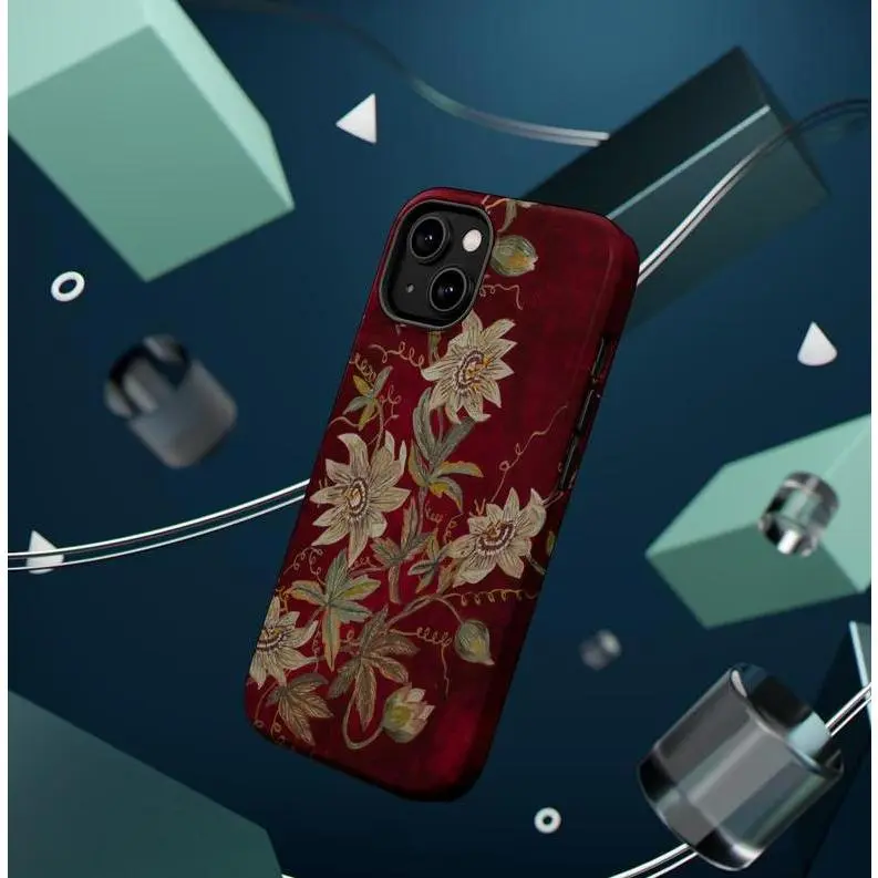 White Passionflowers on Deep Red Tough iPhone Case Waterproof Durable Polycarbonate & Flexible TPU Vintage Retro Cover Gift for Her Phone Case for Samsung and iPhone 17, 16, 15, 14, 13, 12, 11 Pro Max, X, XR, XS Max, 8, Compatible with Samsung Galaxy S25