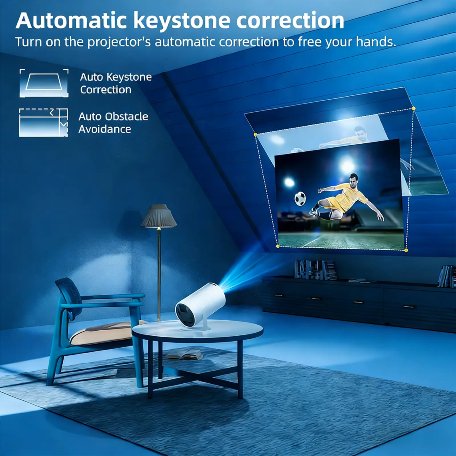 XBJ mini projector with built-in Android system, supports Wi‑Fi and Bluetooth connectivity, features keystone correction and 4K decoding, rotates 180 degrees, designed for short projection use. Suitable for home/outdoor use — Black Friday