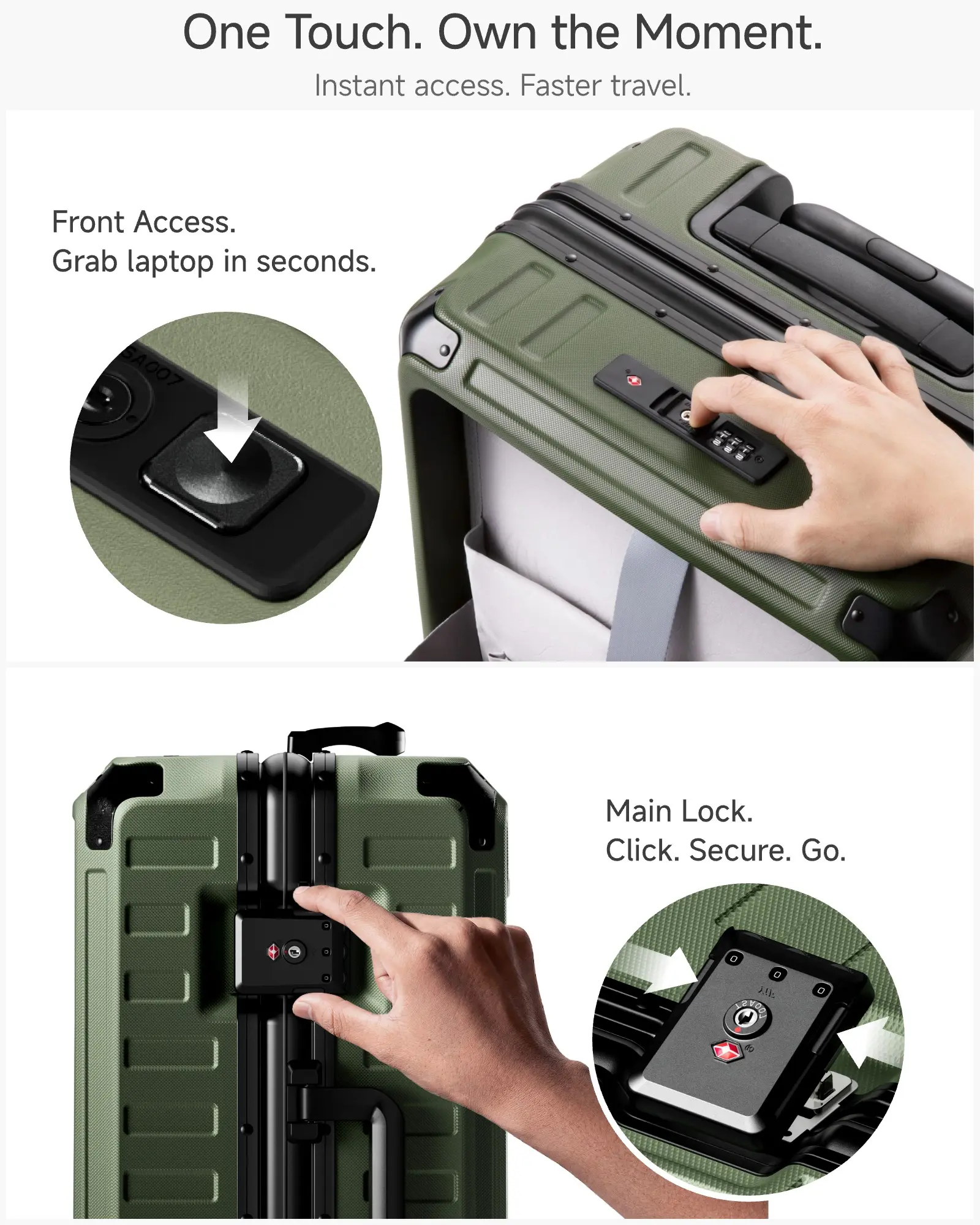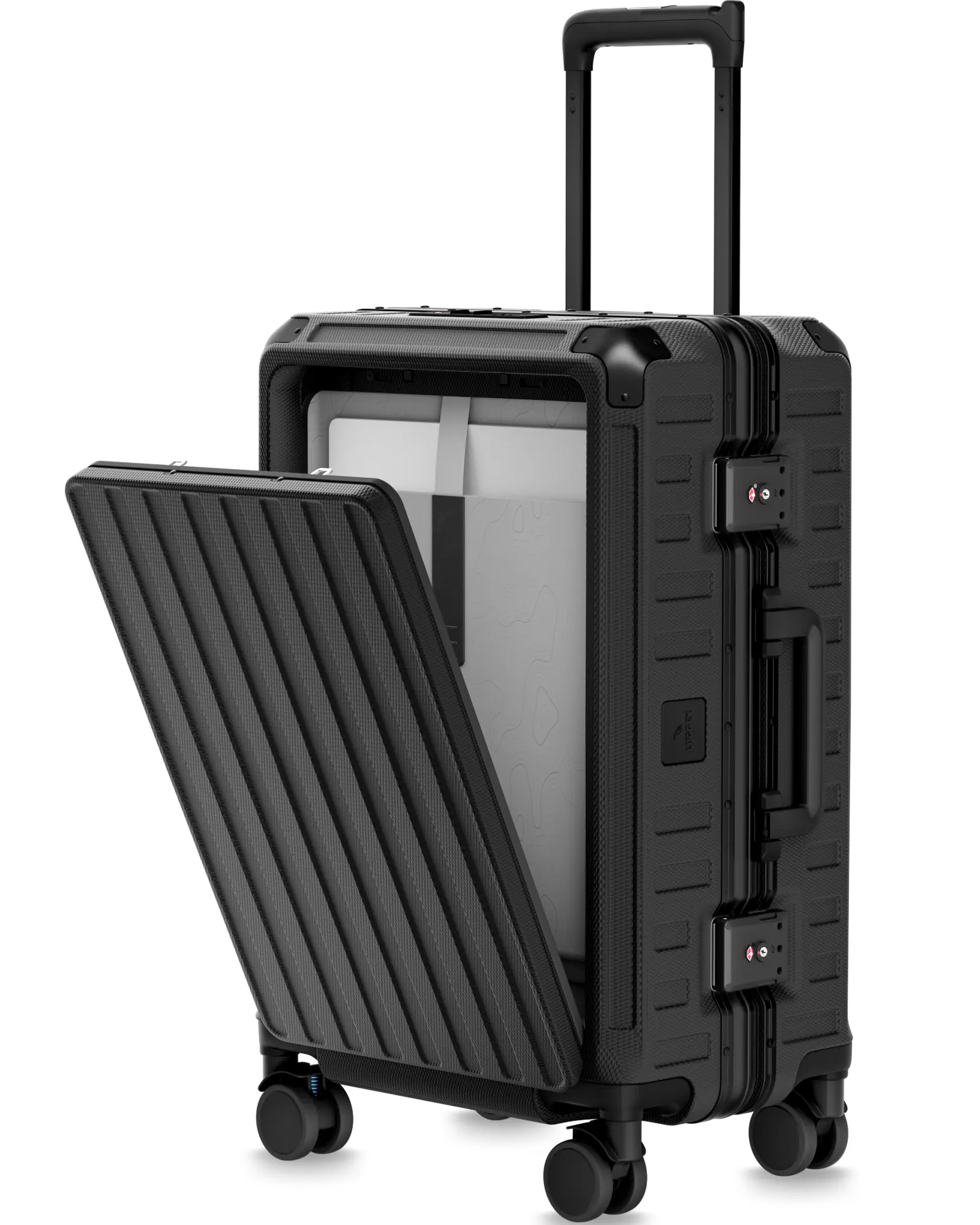 • Aluminum Frame + 100% PC: Built to handle real travel conditions, this carry-on features a thick aluminum frame combined with premium LG polycarbonate for enhanced durability. Reinforced metal corner protectors provide extra impact resistance, while the rigid structure maintains its shape under pressure—stronger and more reliable than standard hardside luggage.