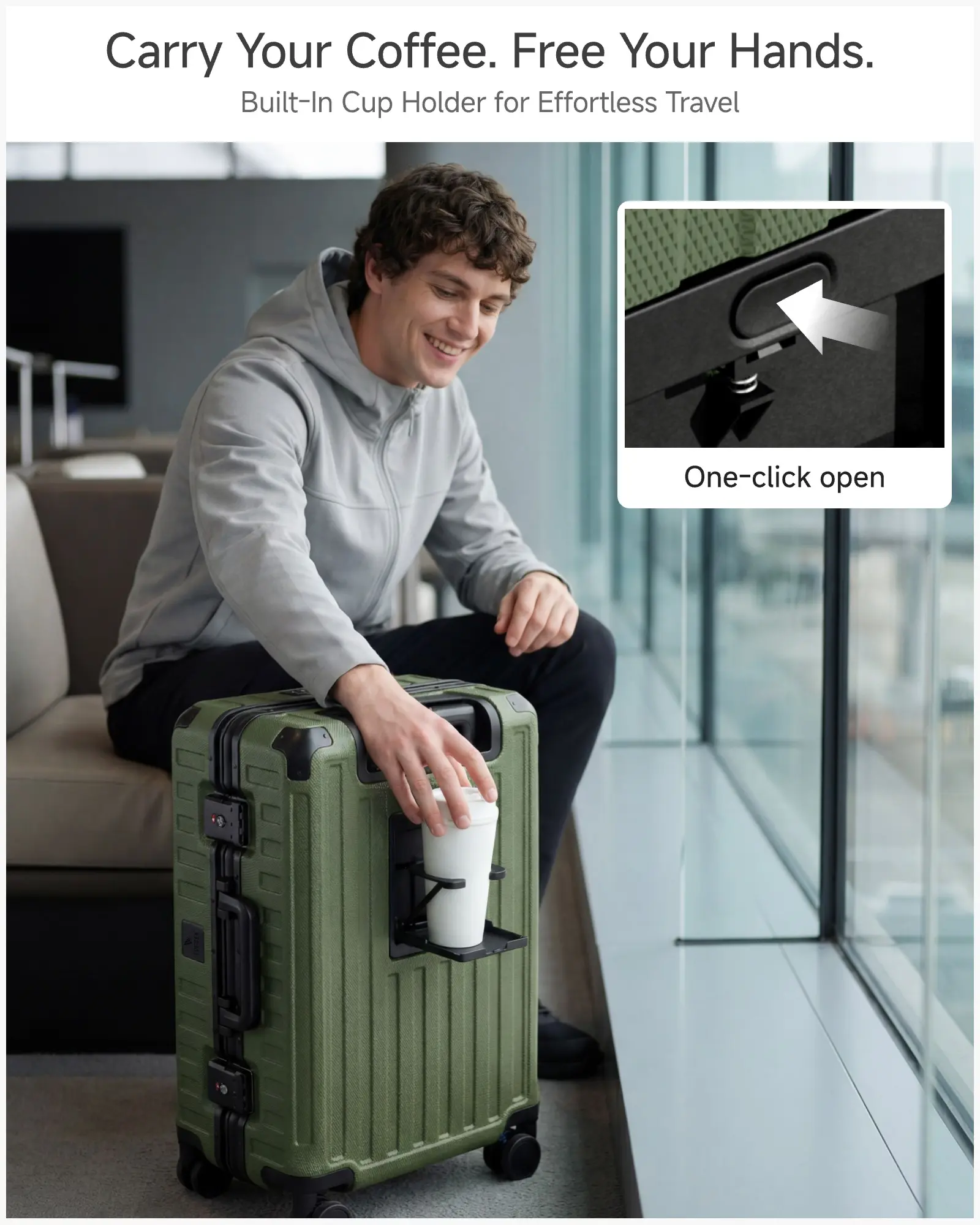 • Carry-On with Cup Holder & Hook: Designed for modern travel, this 38L carry-on fits airline size requirements (22.5" × 15.5" × 9.6") . Stay hands-free with the built-in telescopic handle hook (supports up to 2 lbs), and keep drinks within reach using the one-touch expandable cup holder. Includes a protective cover to keep your suitcase looking new trip after trip—perfect for business trips and weekend getaways.