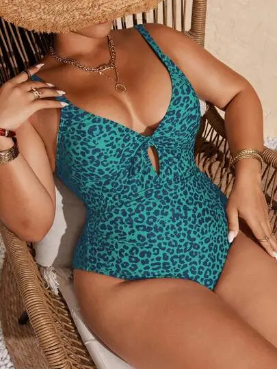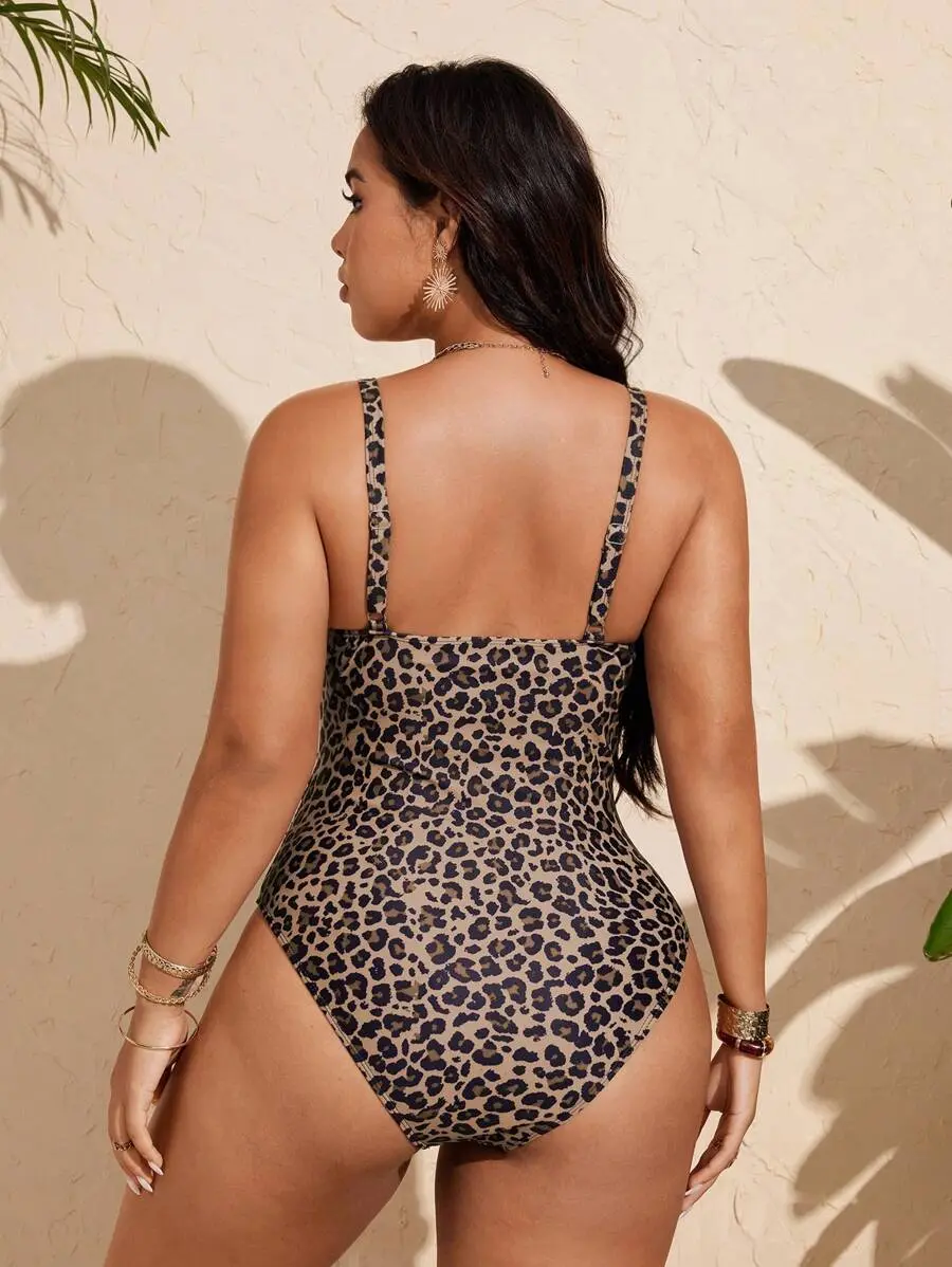 NAVALORA Plus Size Women's One-Piece Fashionable Sexy Leopard Print V-Neck Tie Front Hollow Out Adjustable Straps Casual One-Piece Swimsuit For Summer Beach Vacation