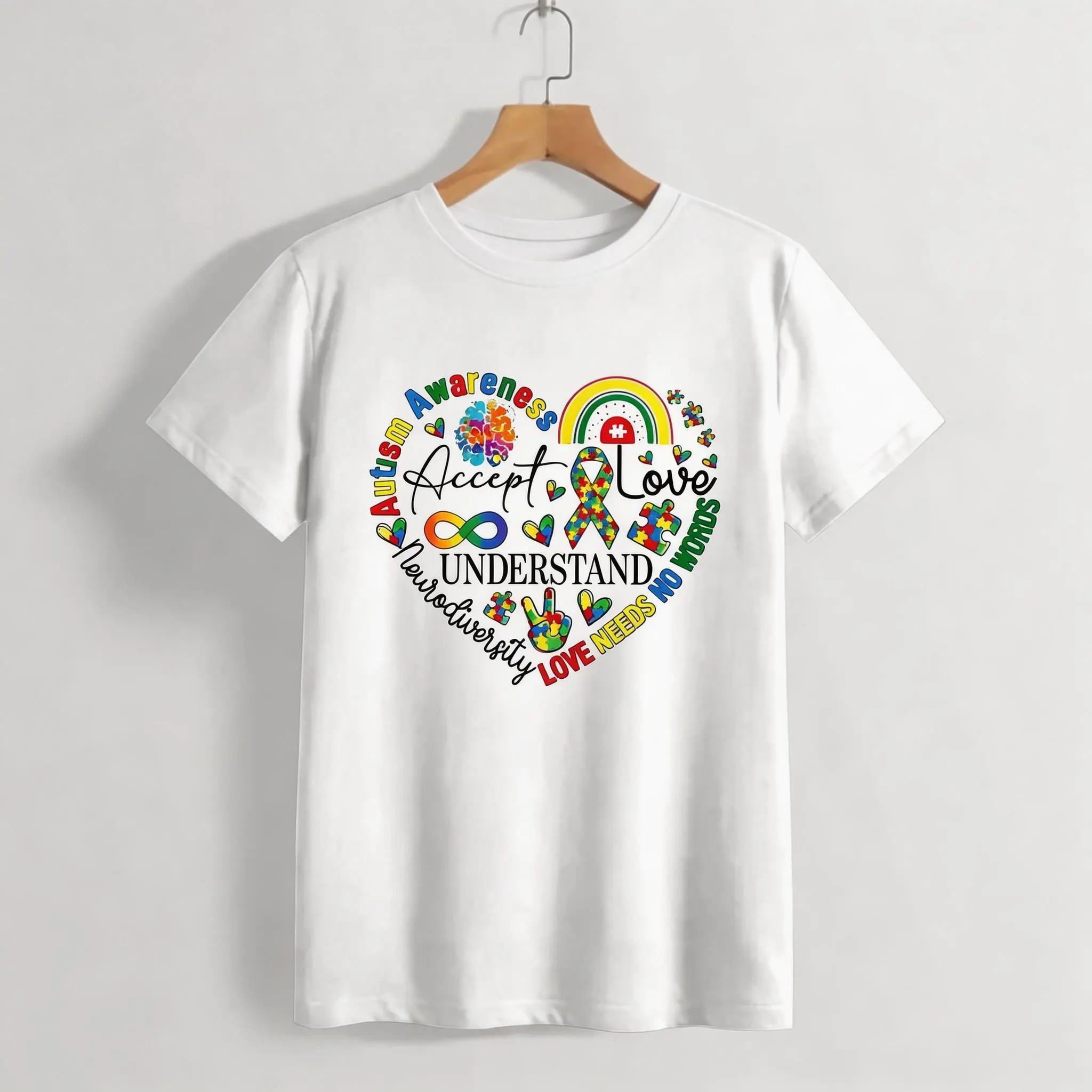 Autism Awareness Accept Love Understand Neurodiversity Love Needs No Words Rainbow Puzzle Piece Heart Design T-Shirt Crewneck Casual Wear For Autism Support And Awareness