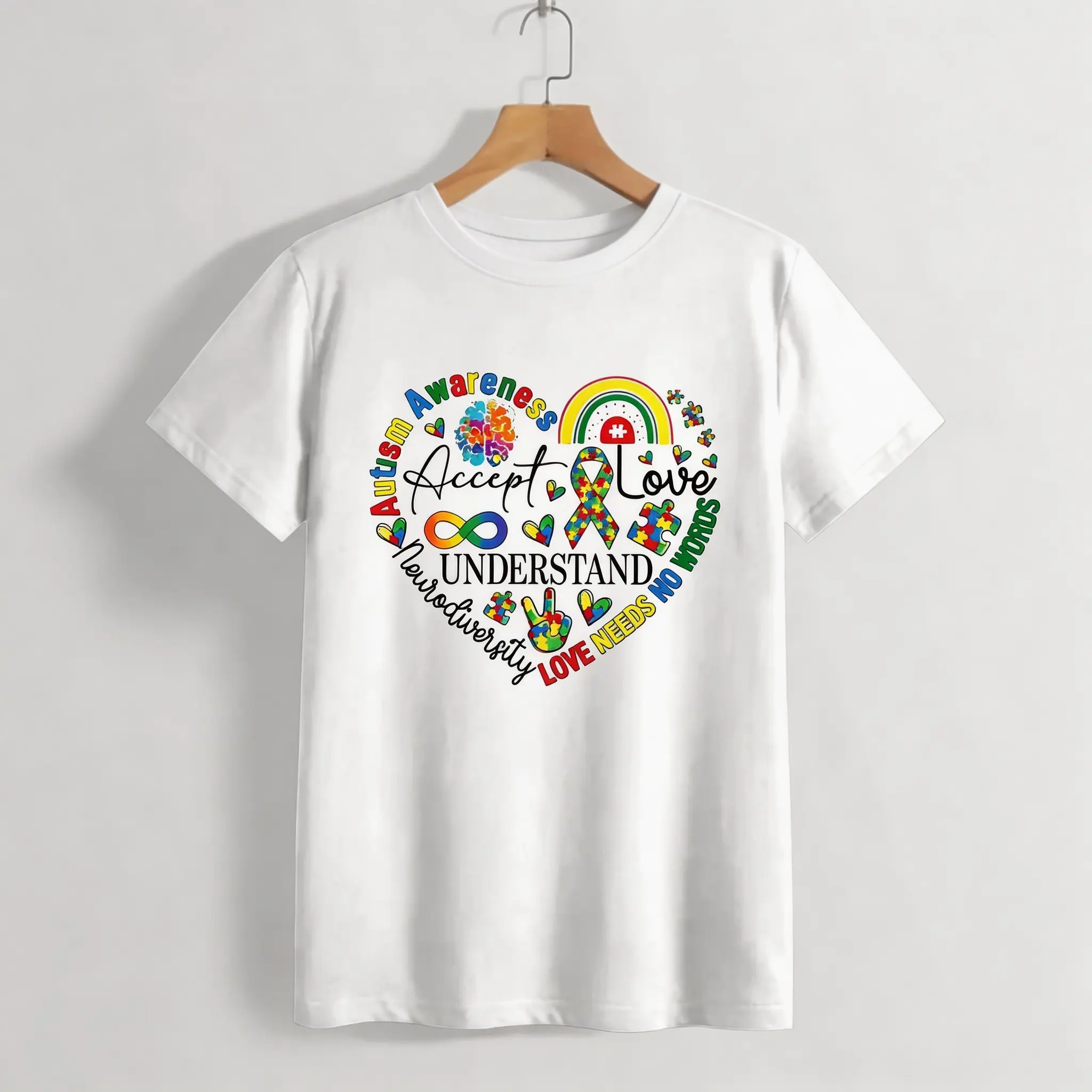 This t-shirt features a heart design with a rainbow puzzle piece, symbolizing neurodiversity and autism awareness. It promotes love and understanding, emphasizing that support doesn't need words. Perfect for those who want to show their commitment to autism support and awareness.