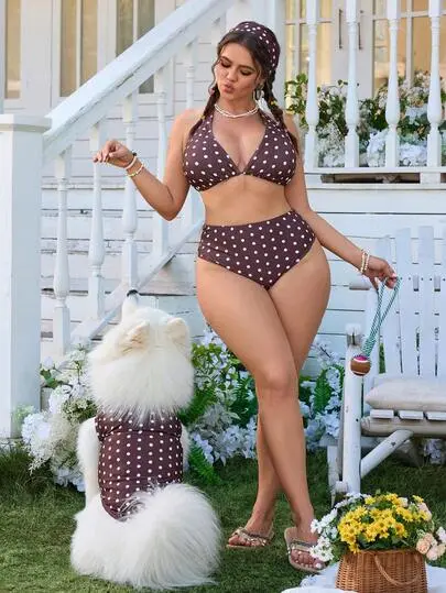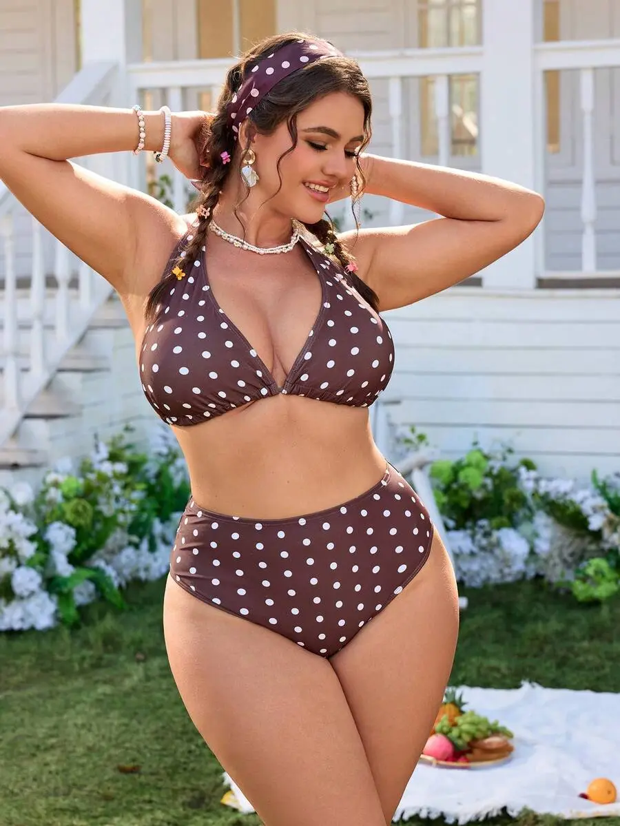 NAVALORA Plus Size Women's 2pcs Coffee Polka Dot Print Bikini Set, Two Pieces Swimsuit, Casual Holiday Style