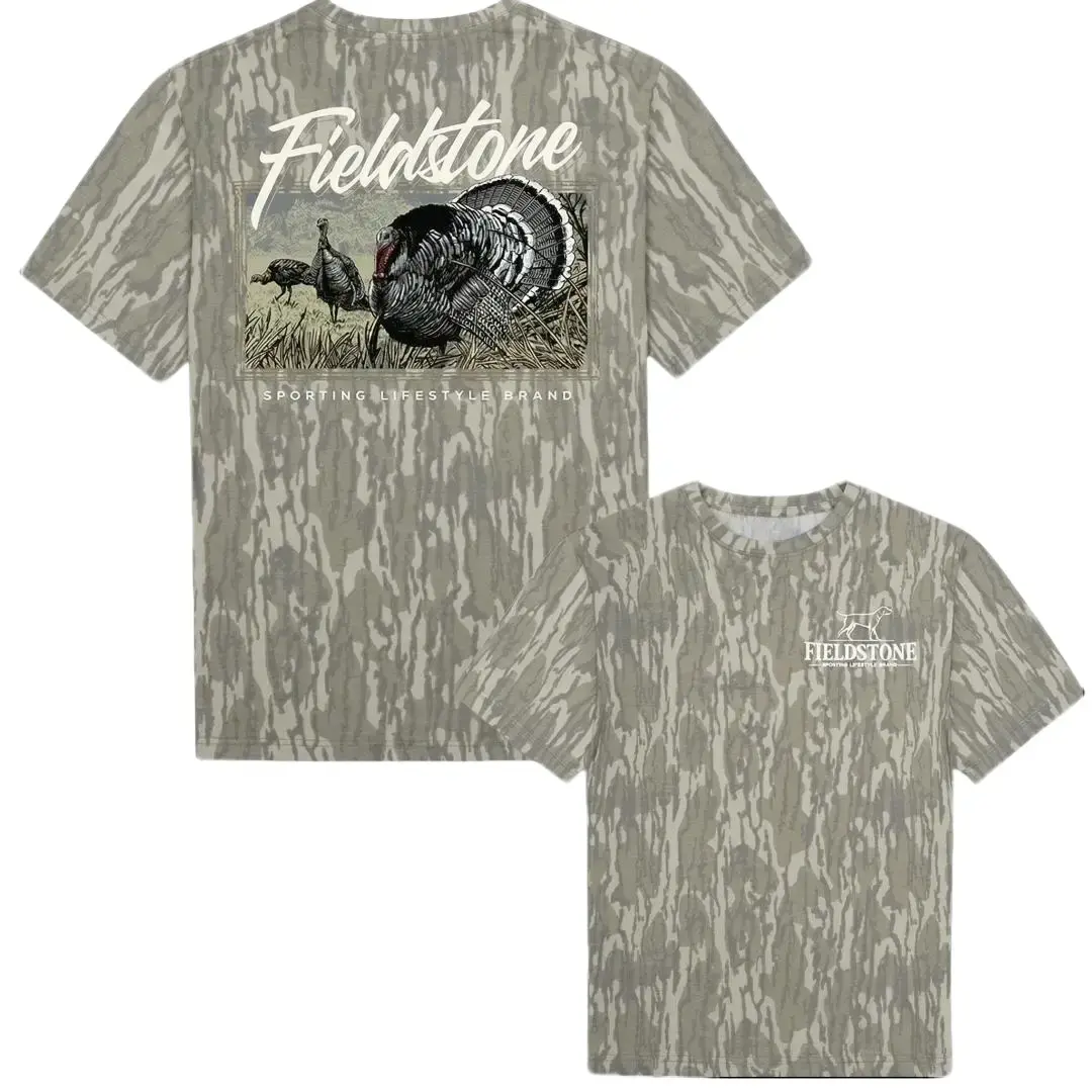 Discover the Fieldstone Camouflage T Shirt, perfect for wild turkey hunting. This graphic tee features a Mossy Oak Bottomland style design. Ideal for turkey enthusiasts, it showcases a turkey bird graphic. Stay stylish and functional in the field.