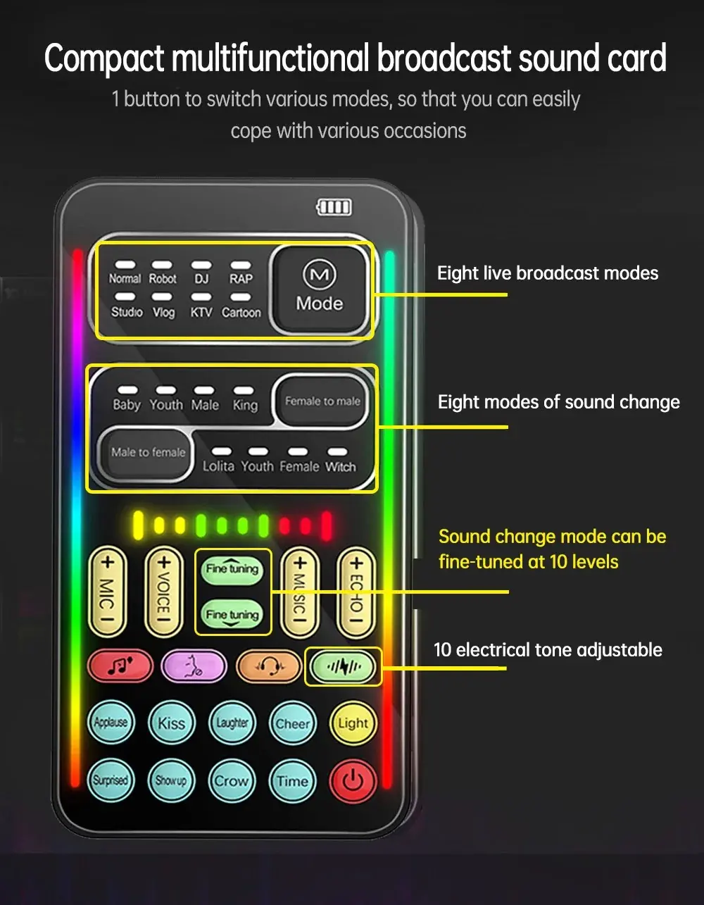 8 live sound effects to control the room. 8 kinds of warm-up sound effects.Easy to heat up the atmosphere of the live broadcast, live interesting