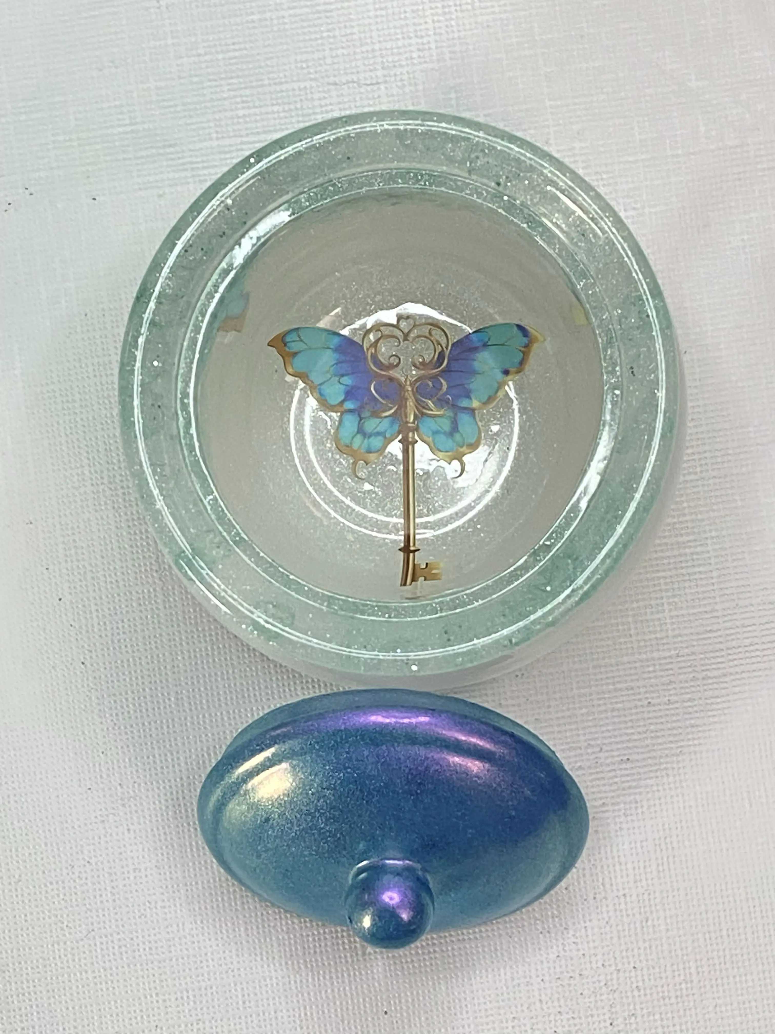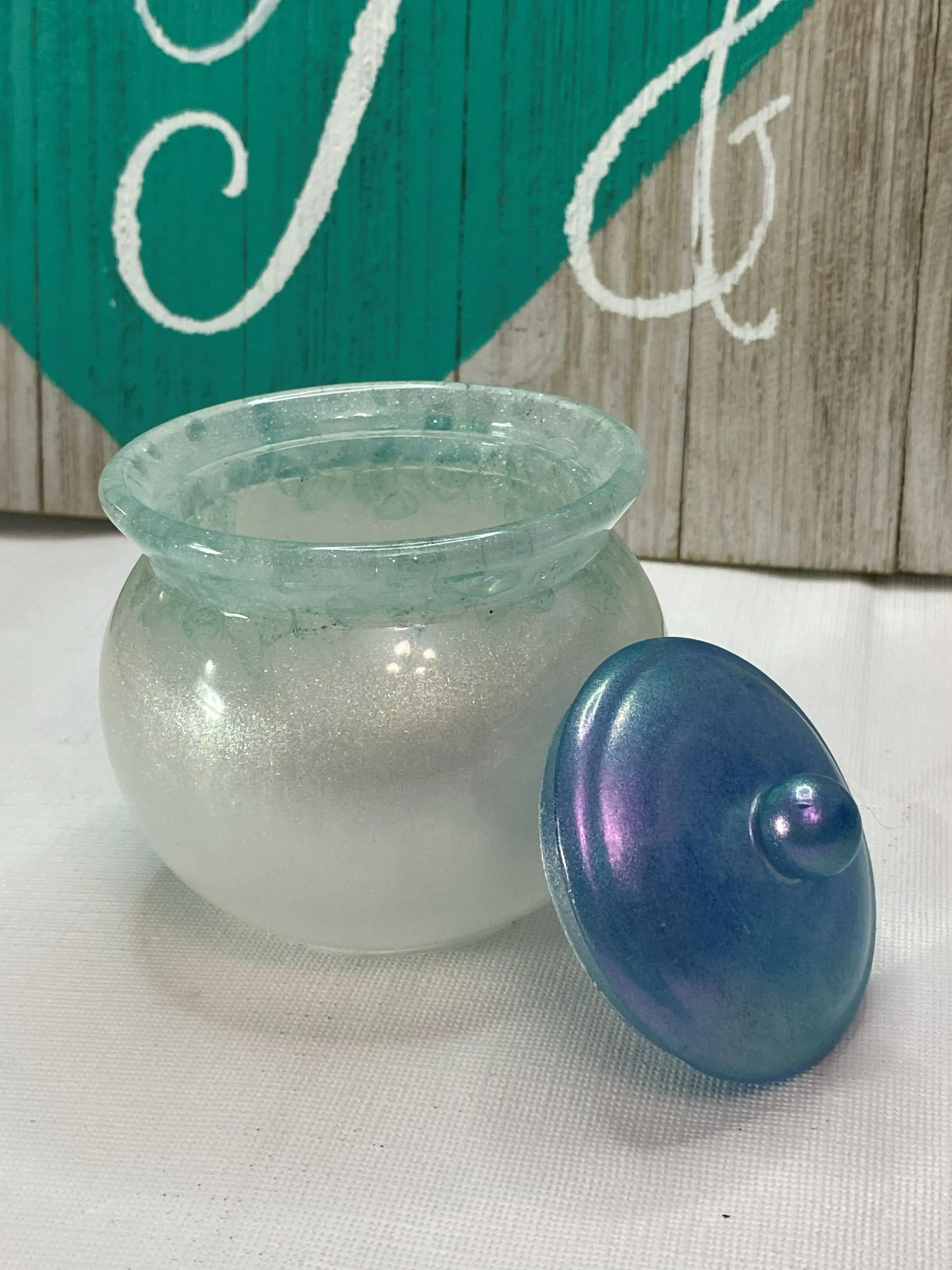 small little storage jar with lid made out of resin/epoxy not recommended for food grade products. we call this one the mermaid jar she is so sparkly and beautiful.