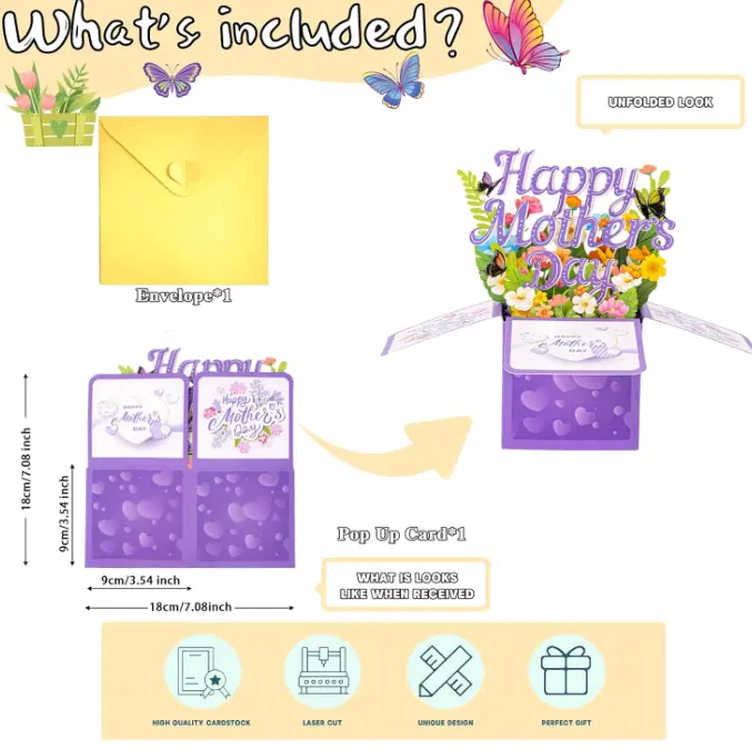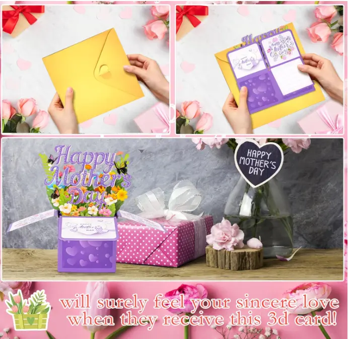 3D Pop-up Mother's Day Card: Surprise your mother with a beautiful and meticulously designed 3D pop-up Mother's Day card! When unfolded, this card will reveal a dazzling array of blooming flowers, dancing butterflies, and the elegant words "Happy Mother's Day". The exquisite craftsmanship of this card conveys your deepest gratitude to her on this special day.