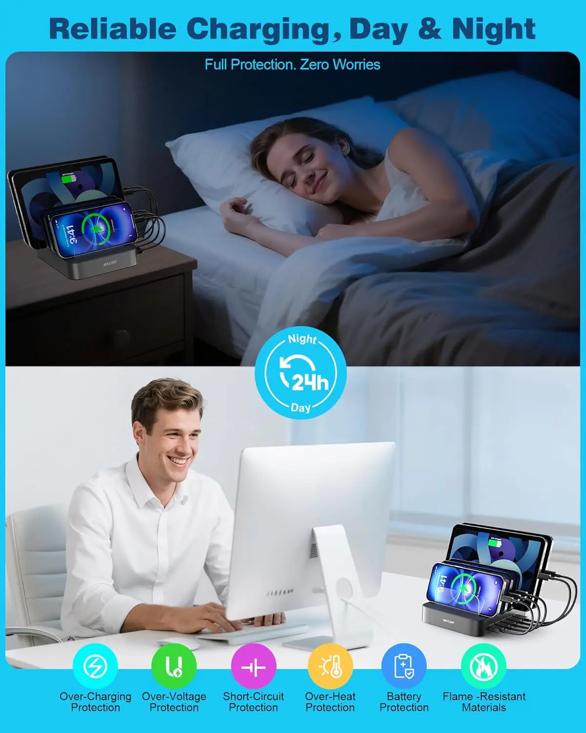 ·【Stable and Smart】This charging station for multiple devices will charge your smartphones, tablets up to 80% than other USB-A charger station with 2.0A or less. Our multiple charging station will automatically detect your devices and adjusts voltage for minimal charging time.