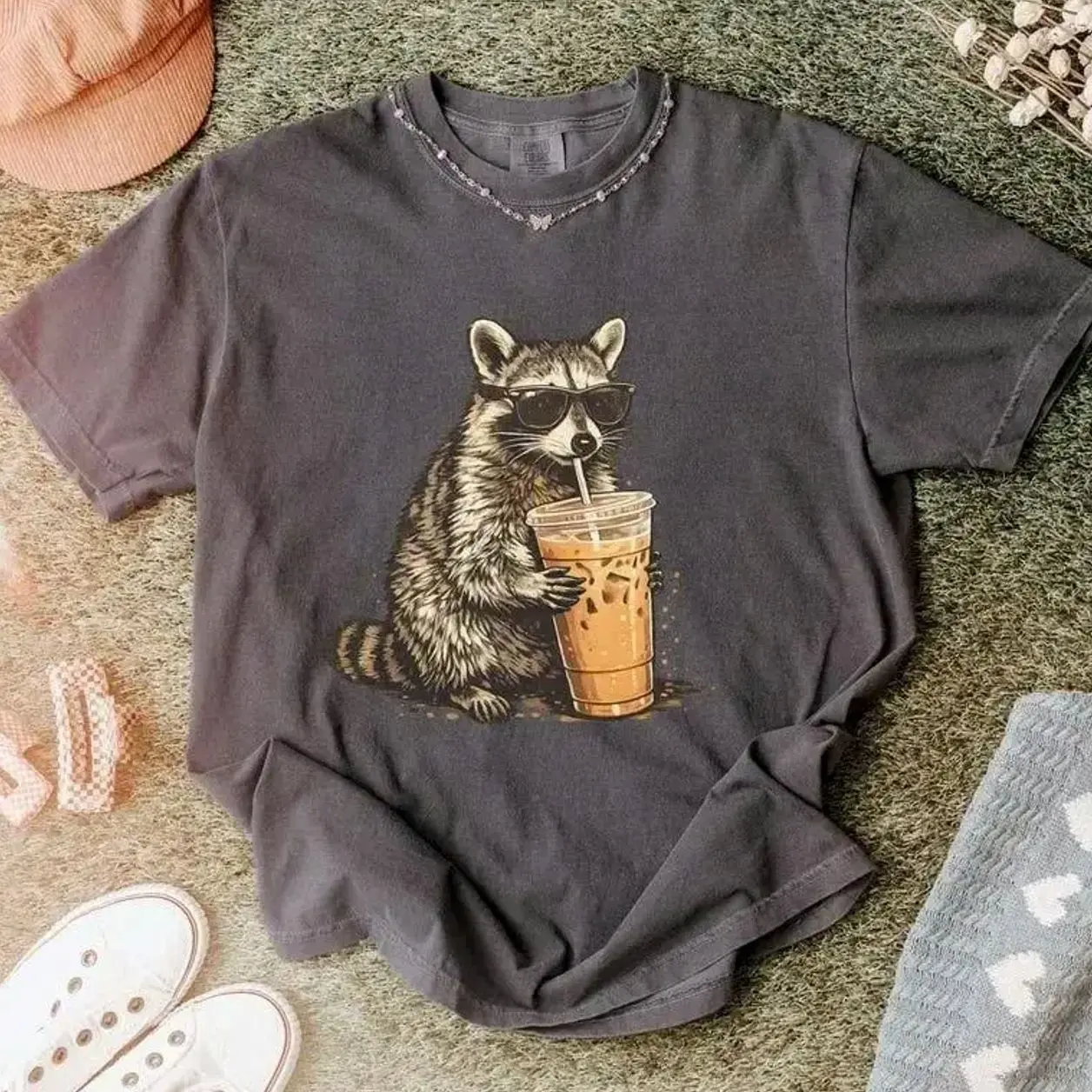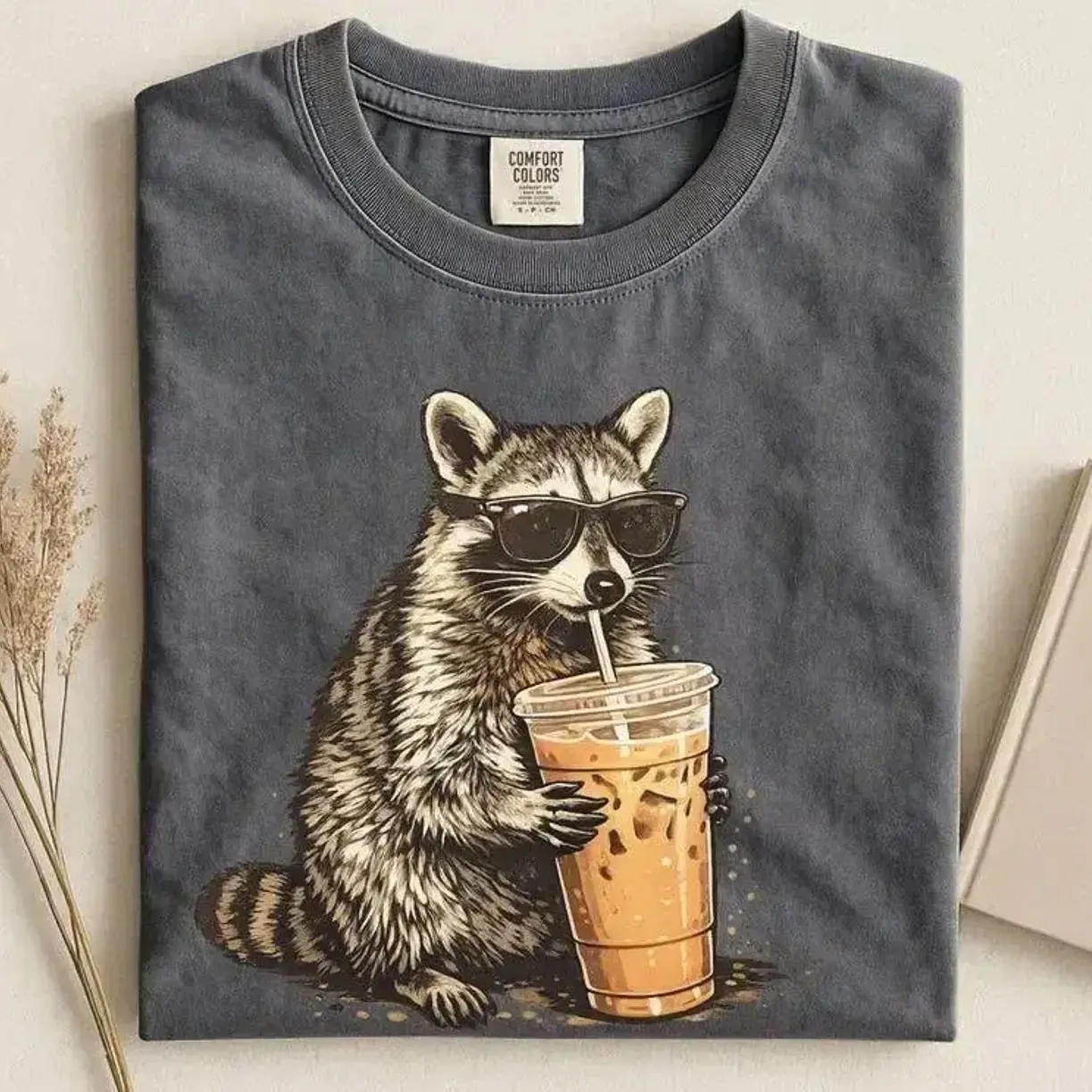 Comfort Colors Raccoon Iced Coffee Shirt, Funny Animal Graphic Tee, Comfort Colors Graphic Tee, Casual Outfit, Vintage Wash Shirt, Oversized Women’s Outfit, Apr 8