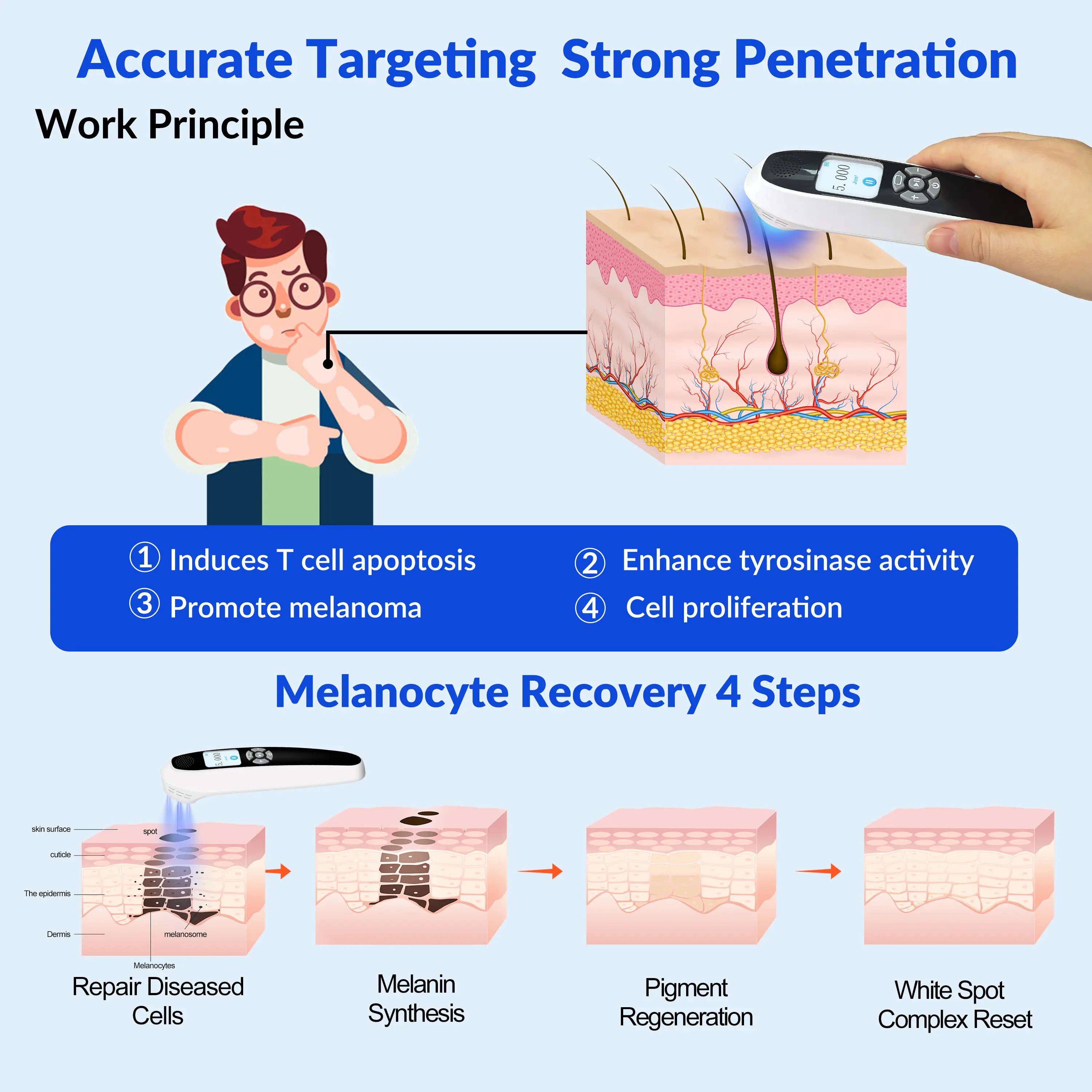 2.Interaction with Skin Cells: The 308nm UVB light penetrates the skin and is absorbed by skin cells, particularly keratinocytes (the primary cells in the epidermis). This interaction leads to several beneficial effects: