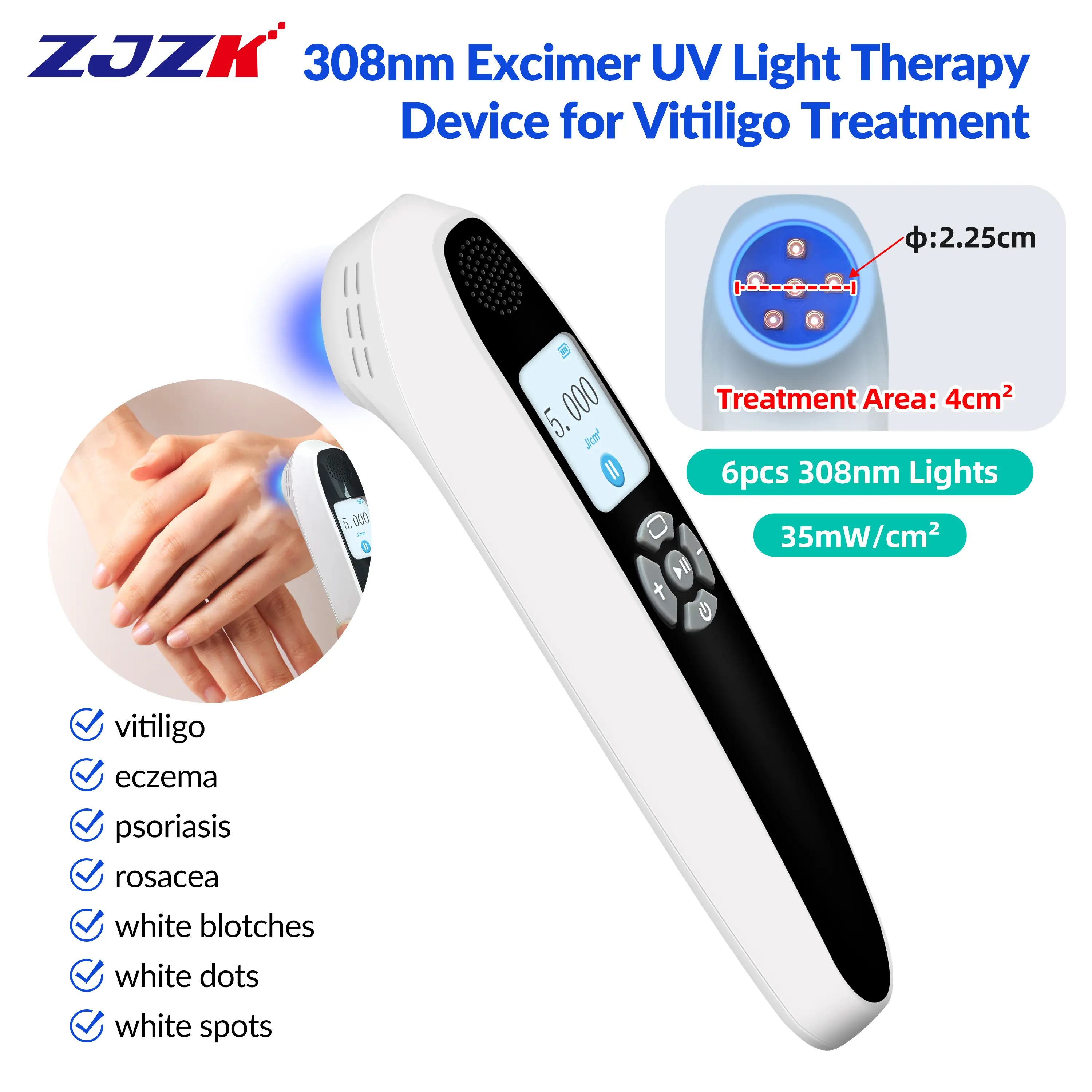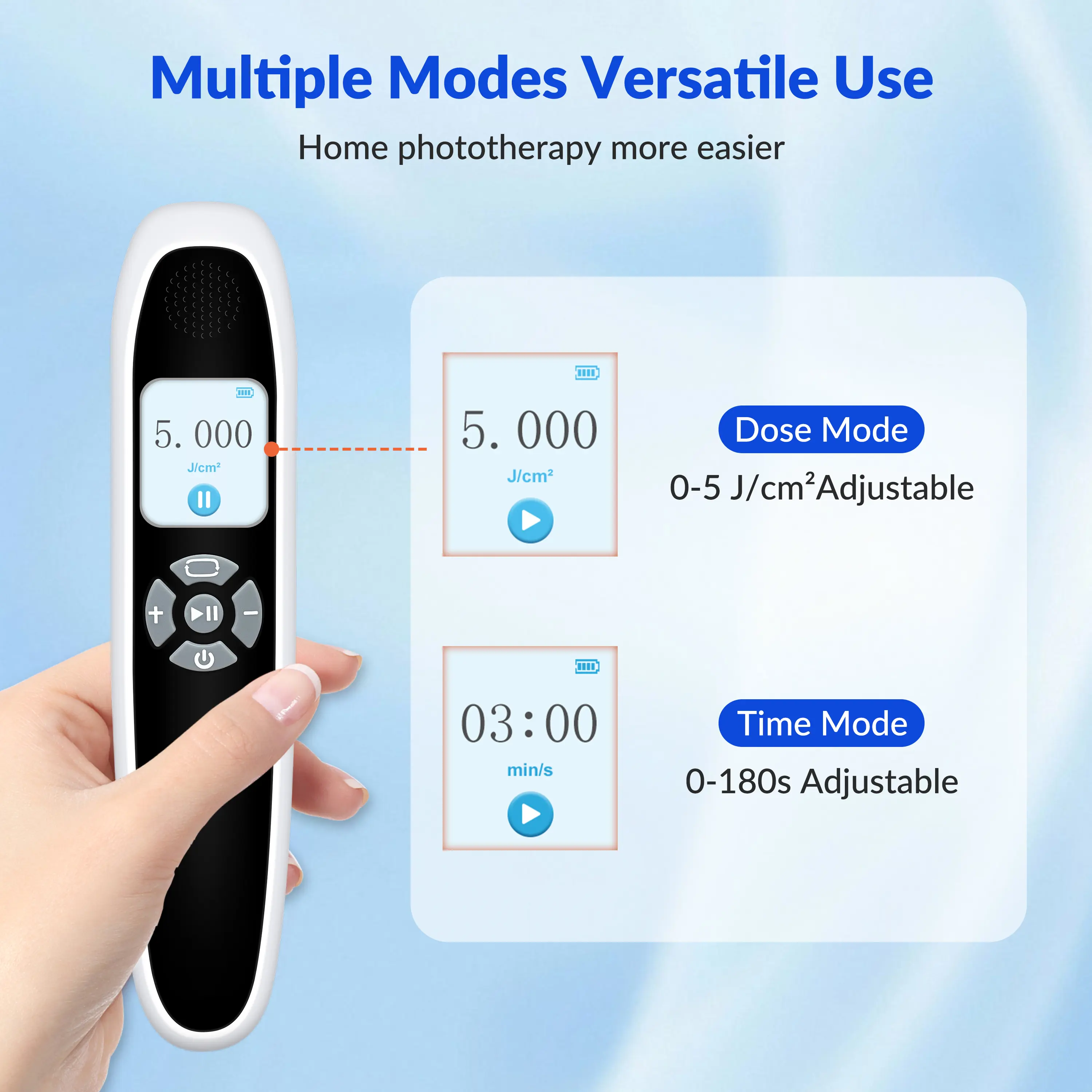 【Multi-functional Mode】The diameter of the lamp bead area of the ultraviolet light therapy lamp is 2.25cm, the irradiation area is 4cm², and the irradiation intensity is 20mW/cm². Dose mode :0-5J/cm² adjustable,Time mode 0-180s adjustable. Phototherapy treatment involves exposure to the light for very short periods of time (1 seconds-180 seconds), 3-4 times each week.