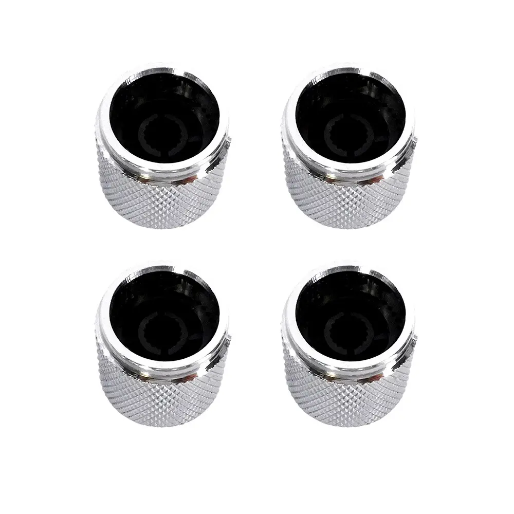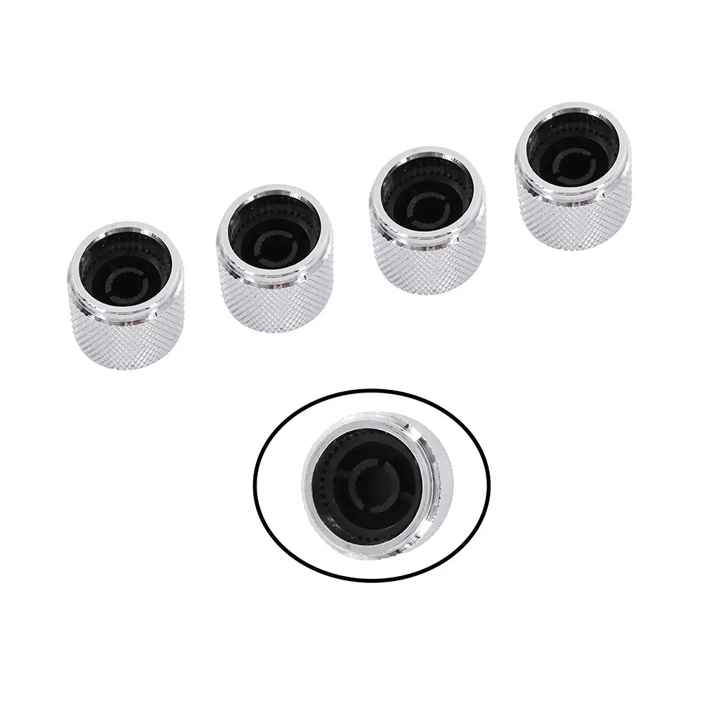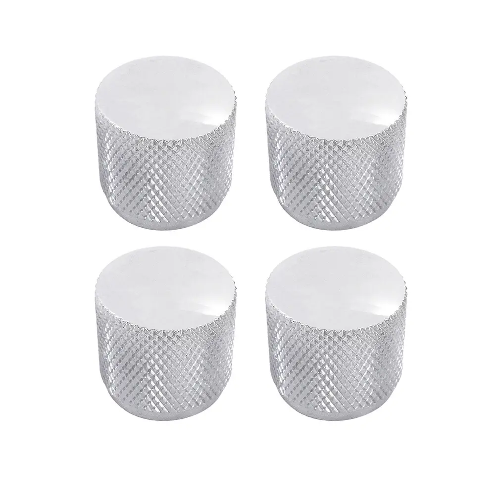 Material: Durable metal body with plastic inside. Shape: Cylinder with a dome. Color: Chrome, as the picture shown. Package includes: 4Pcs guitar knobs.